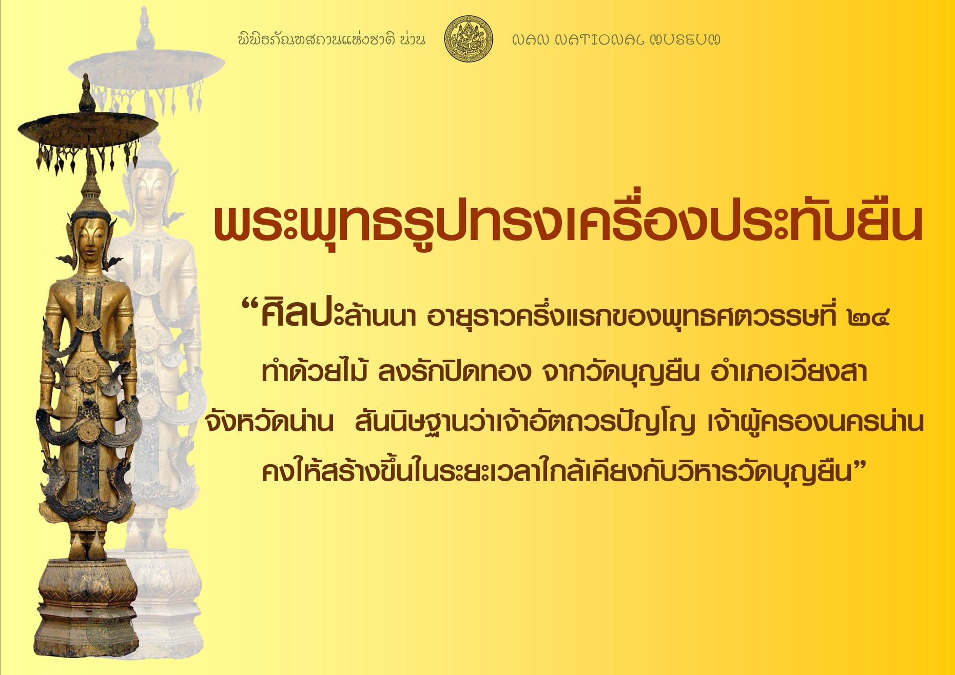 ๘. พระพุทธรูปทรงเครื่องประทับยืน ศิลปะล้านนา อายุราวครึ่งแรกของพุทธศตวรรษที่ ๒๔ ทำด้วยไม้ ลงรักปิดทอง จากวัดบุญยืน อำเภอเวียงสา จังหวัดน่าน สันนิษฐานว่าเจ้าอัตถวรปัญโญ เจ้าผู้ครองนครน่าน องค์ที่ ๕๗ คงให้สร้างขึ้นในระยะเวลาใกล้เคียงกับวิหารวัดบุญยืน