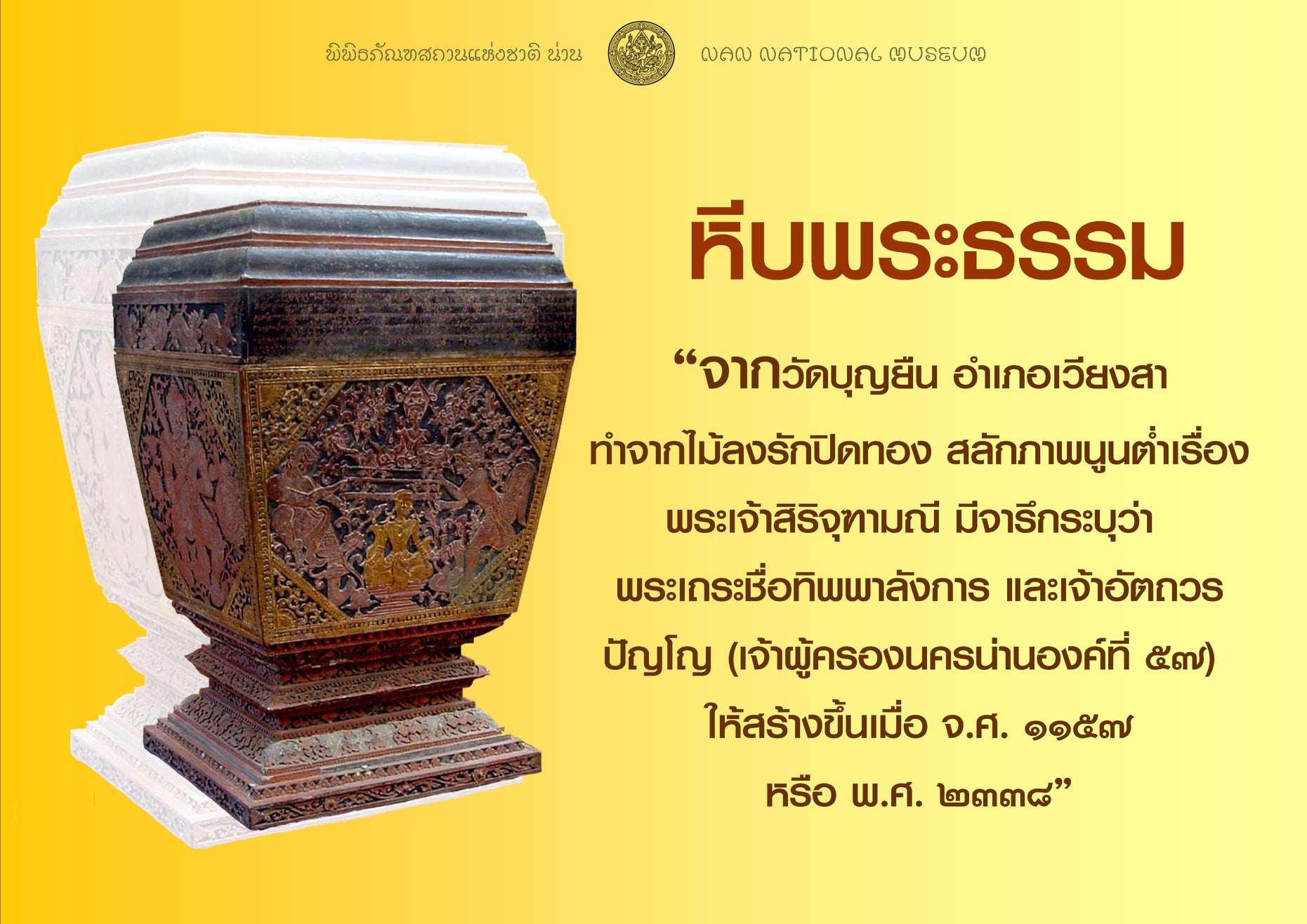 ๙. หีบพระธรรม จากวัดบุญยืน อำเภอเวียงสา ทำจากไม้ลงรักปิดทอง สลักภาพนูนต่ำเรื่องพระเจ้าสิริจุฑามณี มีจารึกระบุว่าพระเถระชื่อทิพพาลังการ และเจ้าผู้ครองนครน่าน (เจ้าอัตถวรปัญโญ) ให้สร้างขึ้นเมื่อ จ.ศ. ๑๑๕๗ หรือ พ.ศ. ๒๓๓๘