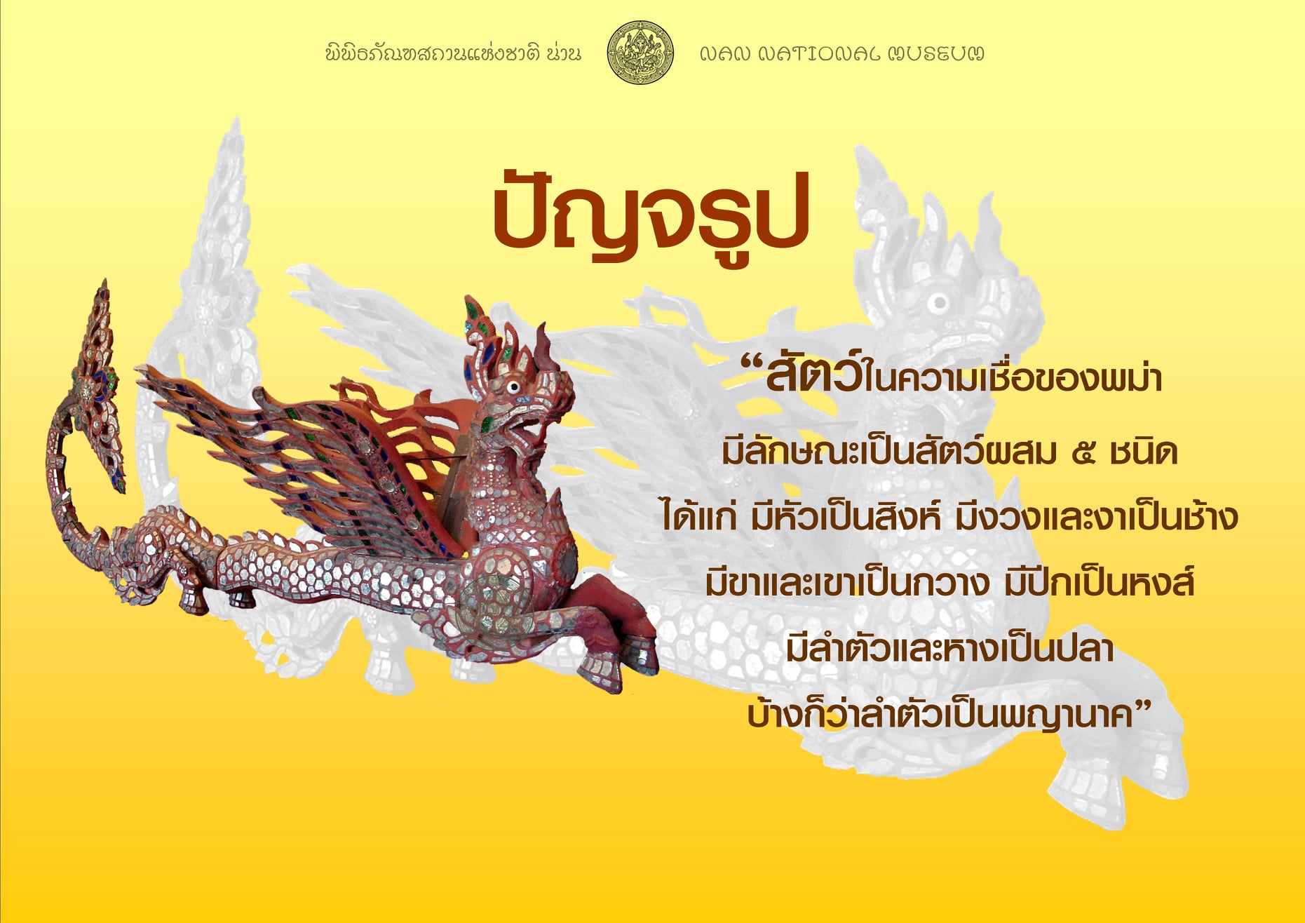 ๑๐. ปัญจรูป สัตว์ในความเชื่อของพม่า มีลักษณะเป็นสัตว์ผสม ๕ ชนิด ได้แก่ มีหัวเป็นสิงห์ มีงวงและงาเป็นช้าง มีขาและเขาเป็นกวาง มีปีกเป็นหงส์ มีลำตัวและหางเป็นปลา บ้างก็ว่าลำตัวเป็นพญานาค