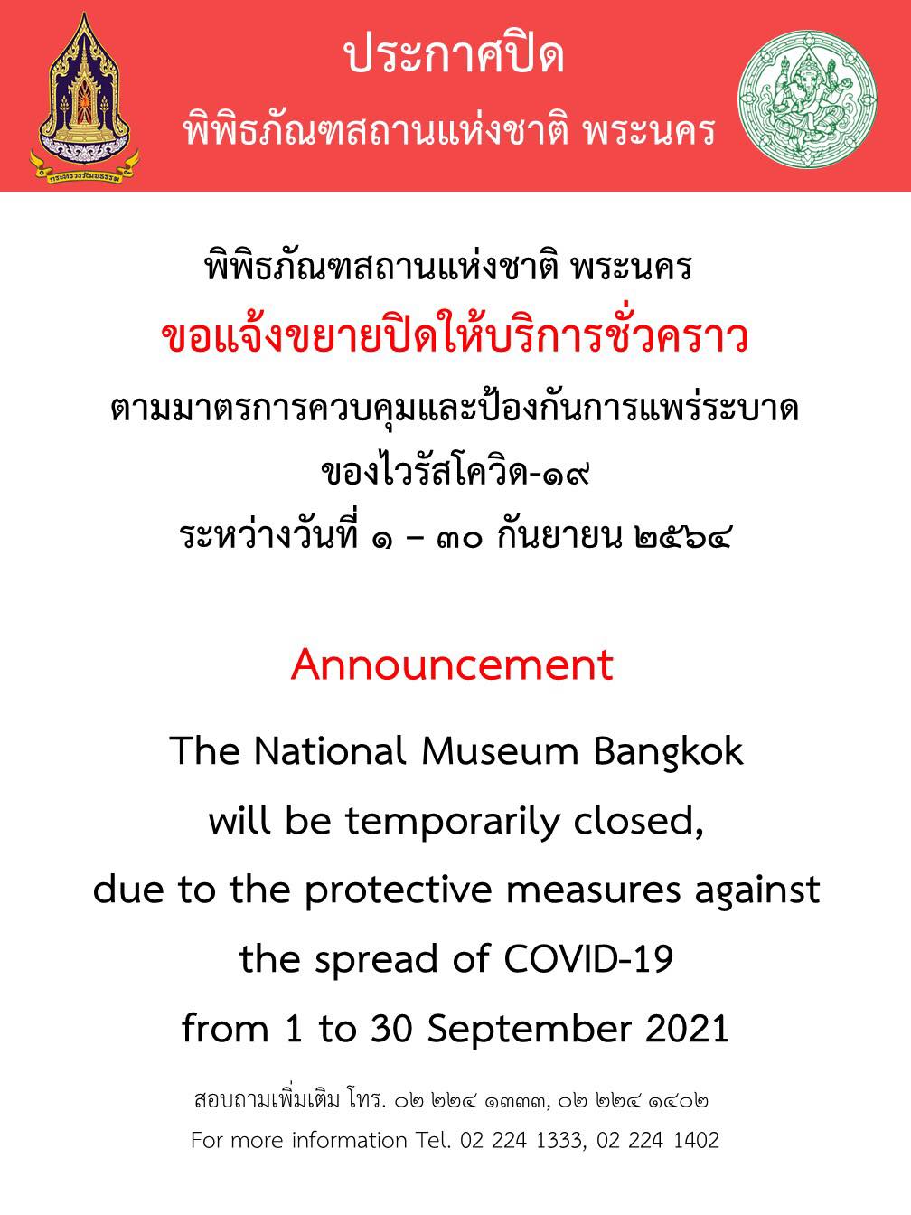 พิพิธภัณฑสถานแห่งชาติ พระนคร แจ้งขยายเวลาปิดให้บริการชั่วคราว ตามประกาศกรุงเทพมหานคร เรื่องสั่งปิดสถานที่เป็นการชั่วคราว (ฉบับที่ ๔๑) เพื่อควบคุมการแพร่ระบาดของโรคติดเชื้อไวรัสโคโรนา ๒๐๑๙ (COVID-19) ต่อไปจนถึงวันที่ ๓๐ กันยายน ๒๕๖๔