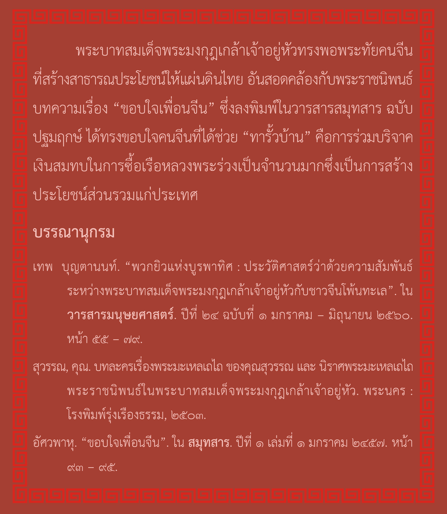 องค์ความรู้ : กลุ่มภาษาและวรรณกรรม สำนักวรรณกรรมและประวัติศาสตร์ เรื่อง คนจีนตัวอย่างในพระราชทรรศนะพระบาทสมเด็จพระมงกุฎเกล้าเจ้าอยู่หัว โดยนายปารเมศ อภัยฤทธิรงค์ นักอักษรศาสตร์ปฏิบัติการ