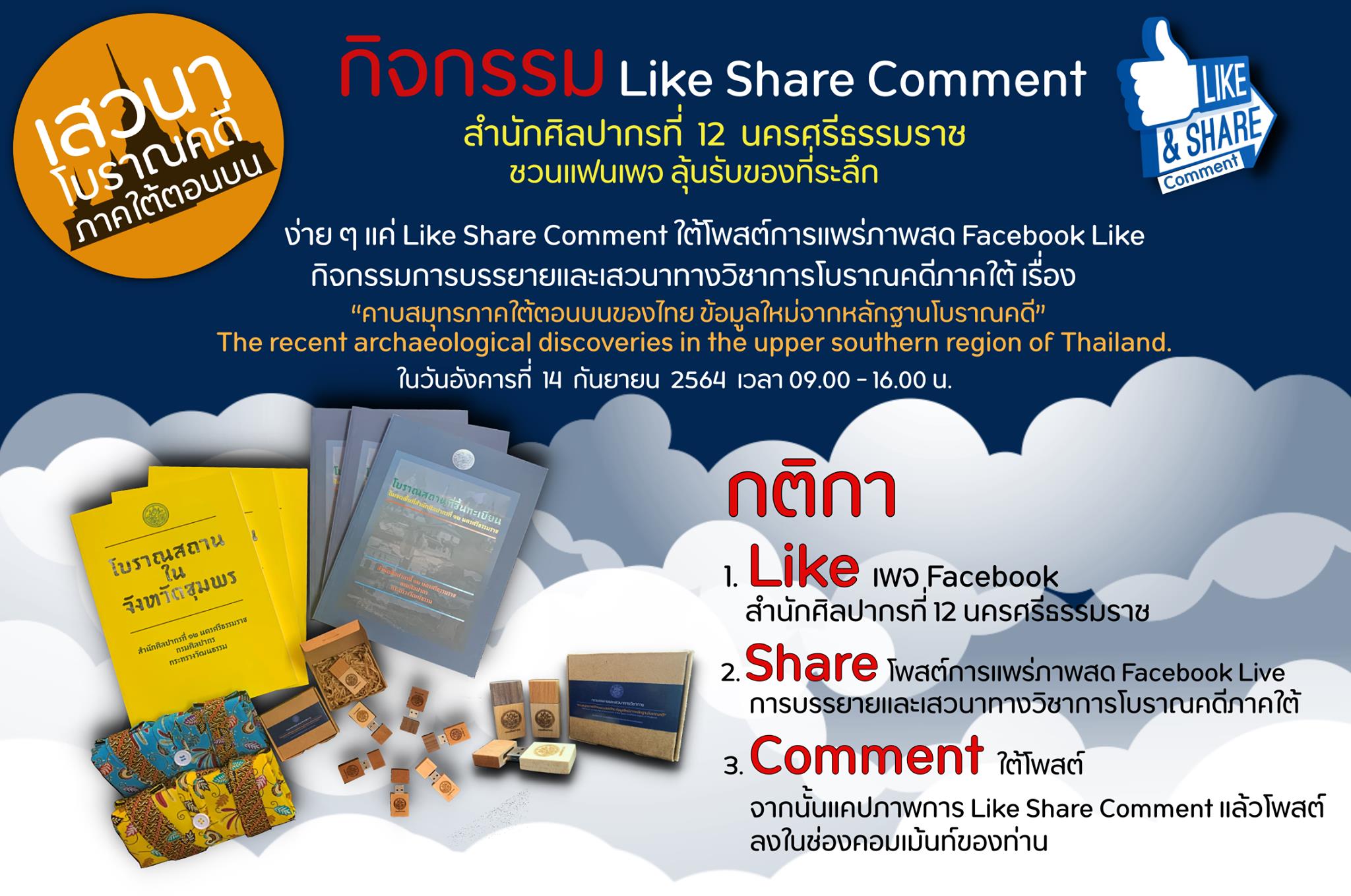 ทั้งนี้ ขอชวนแฟนเพจมาร่วมสนุกในกิจกรรม Like Share Comment ลุ้นรับของที่ระลึกในกิจกรรมการบรรยายและเสวนาโบราณคดีภาคใต้ตอนบน สำหรับผู้ร่วมรับฟังตลอดการบรรยายและเสวนา จำนวนจำกัดเพียง 14 รางวัลเท่านั้น ผู้สนใจสามารถติดตามกติกา ได้ทางเพจ Facebook สำนักศิลปากรที่ ๑๒ นครศรีธรรมราช https://web.facebook.com/nakhon.museum