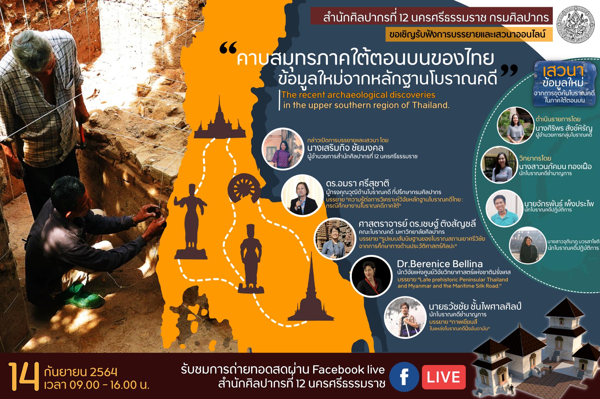 สำนักศิลปากรที่ 12 นครศรีธรรมราช ขอเชิญร่วมฟังการบรรยายและเสวนาทางวิชาการเผยแพร่ความรู้โบราณคดีภาคใต้ตอนบน เรื่อง "คาบสมุทรภาคใต้ตอนบนของไทย ข้อมูลใหม่จากหลักฐานโบราณคดี: The recent archaeological discoveries in the upper southern region of Thailand." ในวันอังคารที่ 14 กันยายน 2564 เวลา 09.00 - 16.00 น. ผ่านทาง Facebook Live : สำนักศิลปากรที่ ๑๒ นครศรีธรรมราช กำหนดการบรรยายและเสวนาออนไลน์