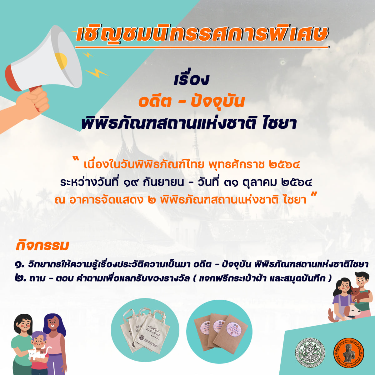 พิพิธภัณฑสถานแห่งชาติ ไชยา ขอเชิญชมนิทรรศการพิเศษเนื่องในวันพิพิธภัณฑ์ไทย ประจำปี ๒๕๖๔ ในหัวข้อ "อดีต - ปัจจุบัน พิพิธภัณฑสถานแห่งชาติ ไชยา" ระหว่างวันที่ ๑๙ กันยายน ๒๕๖๔ - ๓๑ ตุลาคม ๒๕๖๔ ณ อาคารจัดแสดง ๒ พิพิธภัณฑสถานแห่งชาติ ไชยา จังหวัดสุราษฎร์ธานี โดยจะมีวิทยากรให้ความรู้เรื่องประวัติความเป็นมาของพิพิธภัณฑ์ตั้งแต่อดีตจนถึงปัจจุบัน และผู้เข้าชมจะได้ร่วมสนุกกับกิจกรรมถาม - ตอบ เกี่ยวกับความรู้ที่ได้จากการชมนิทรรศการ เพื่อลุ้นรับของรางวัล (กระเป๋าผ้า สมุดบันทึก และหน้ากากอนามัย) ทั้งนี้ เพื่อปฎิบัติตามมาตรการป้องกันโรคระบาดโควิด ๑๙ อย่างเคร่งครัด ขอความร่วมมือนักท่องเที่ยวสวมหน้ากากอนามัยตลอดการเข้าชม และเว้นระยะห่างทางสังคม เพื่อความปลอดภัยของเจ้าหน้าที่และผู้เข้าชมทุกท่าน