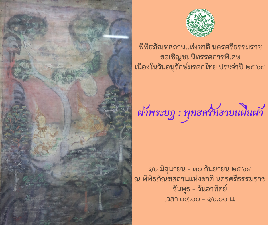 พิพิธภัณฑสถานแห่งชาติ นครศรีธรรมราช จัดนิทรรศการพิเศษเนื่องในวันอนุรักษ์มรดกไทย ประจำปี ๒๕๖๔ เรื่อง “ผ้าพระบฏ : พุทธศรัทธาบนผืนผ้า” ระหว่างวันที่ ๑๖ มิถุนายน - ๓๐ กันยายน ๒๕๖๔
