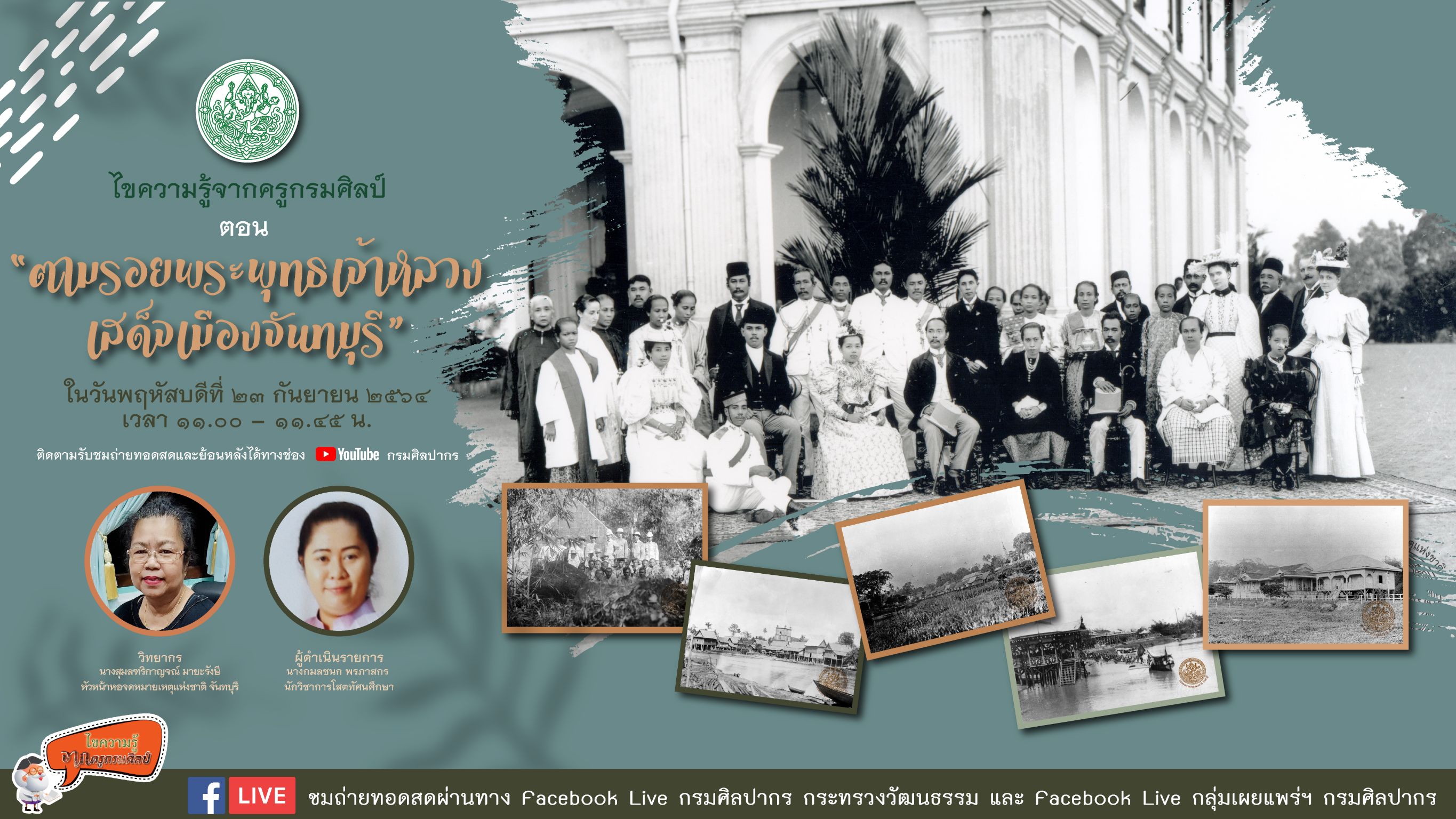 กรมศิลปากร ขอเชิญรับชมถ่ายทอดสด Facebook Live รายการไขความรู้จากครูกรมศิลป์ ตอน “ตามรอยพระพุทธเจ้าหลวงเสด็จเมืองจันทบุรี” วิทยากรโดย นางสุมลฑริกาญจณ์ มายะรังษี หัวหน้าหอจดหมายเหตุแห่งชาติ จันทบุรี ดำเนินรายการโดย นางกมลชนก พรภาสกร นักวิชาการโสตทัศนศึกษา กลุ่มเผยแพร่และประชาสัมพันธ์ ในวันพฤหัสบดีที่ ๒๓ กันยายน ๒๕๖๔ เวลา ๑๑.๐๐ – ๑๑.๔๕ น.