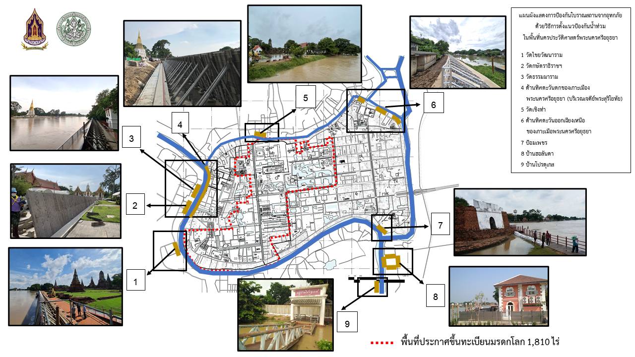 ๑. โบราณสถานวัดไชยวัฒนาราม ใช้วิธีการป้องกันน้ำท่วมโดยวิธีการตั้งแผงป้องกันน้ำท่วมรูปแบบที่ สามารถยกตั้งขึ้นและพับเก็บได้บริเวณด้านตะวันออกของวัดริมแม่น้ำ แนวป้องกันน้ำท่วมมีความยาว ๑๖๐ เมตร สูงจากผิวบนสุดของขอบตลิ่ง ๑.๘๐ เมตร และสามารถต่อความสูง เพิ่มเติมเป็น ๒.๘๐ เมตร ส่วนด้านใต้ ด้านตะวันตก มีแนวกำแพงป้องกันน้ำถาวรก่อด้วยคอนกรีตเสริมเหล็ก ส่วนด้านเหนือใช้แนวทางหลวงแผ่นดินหมายเลข ๓๔๖๙