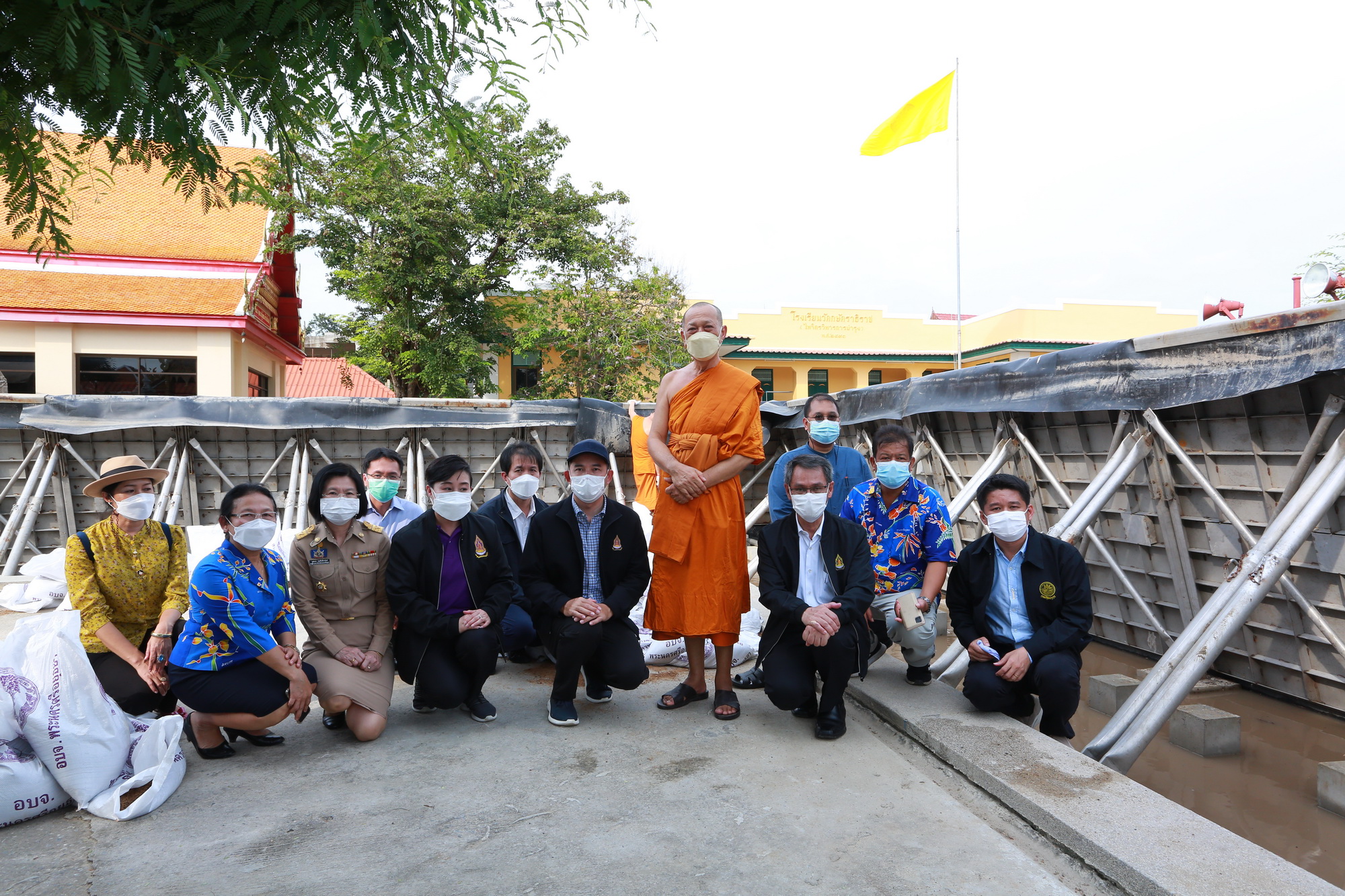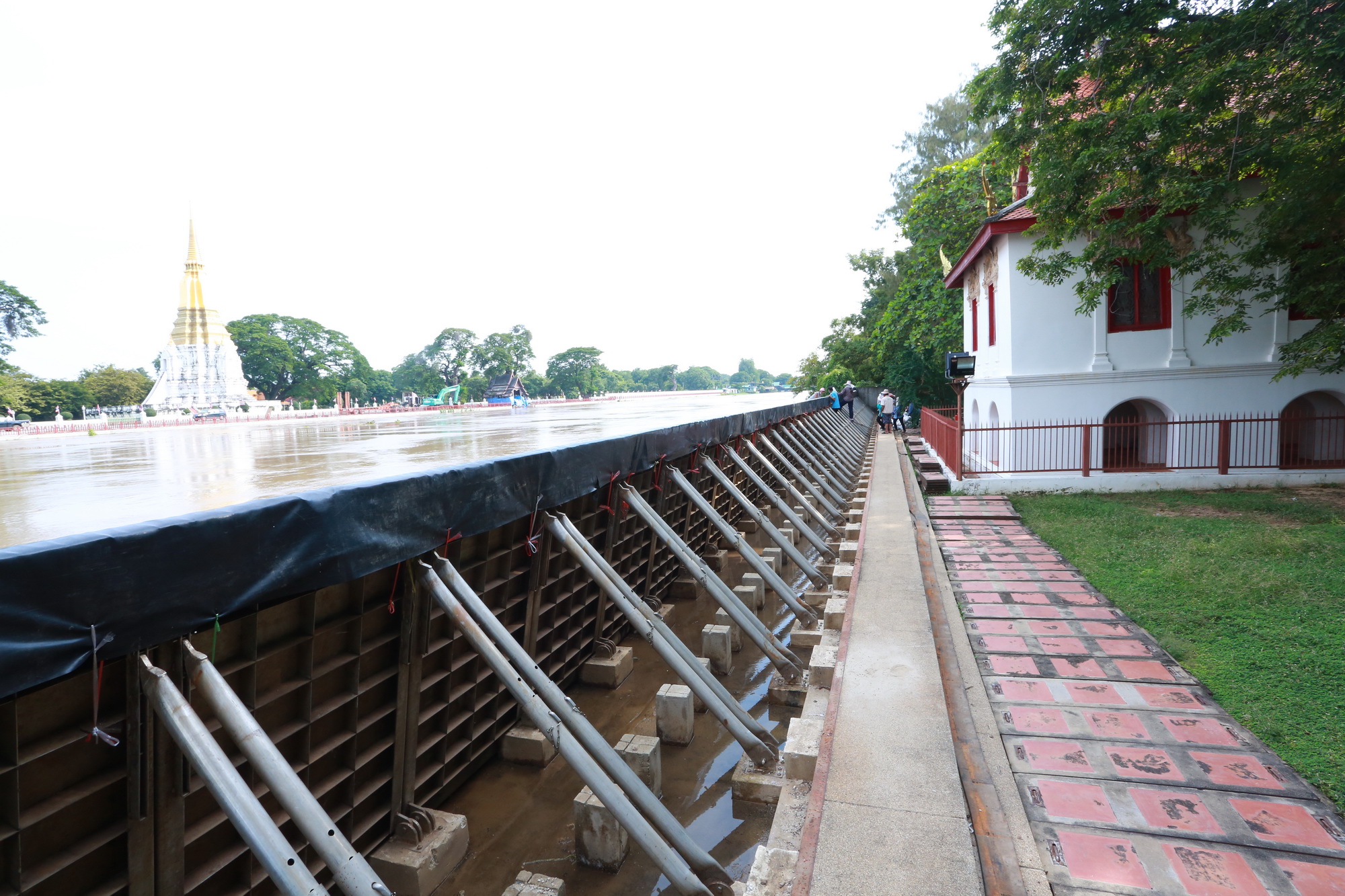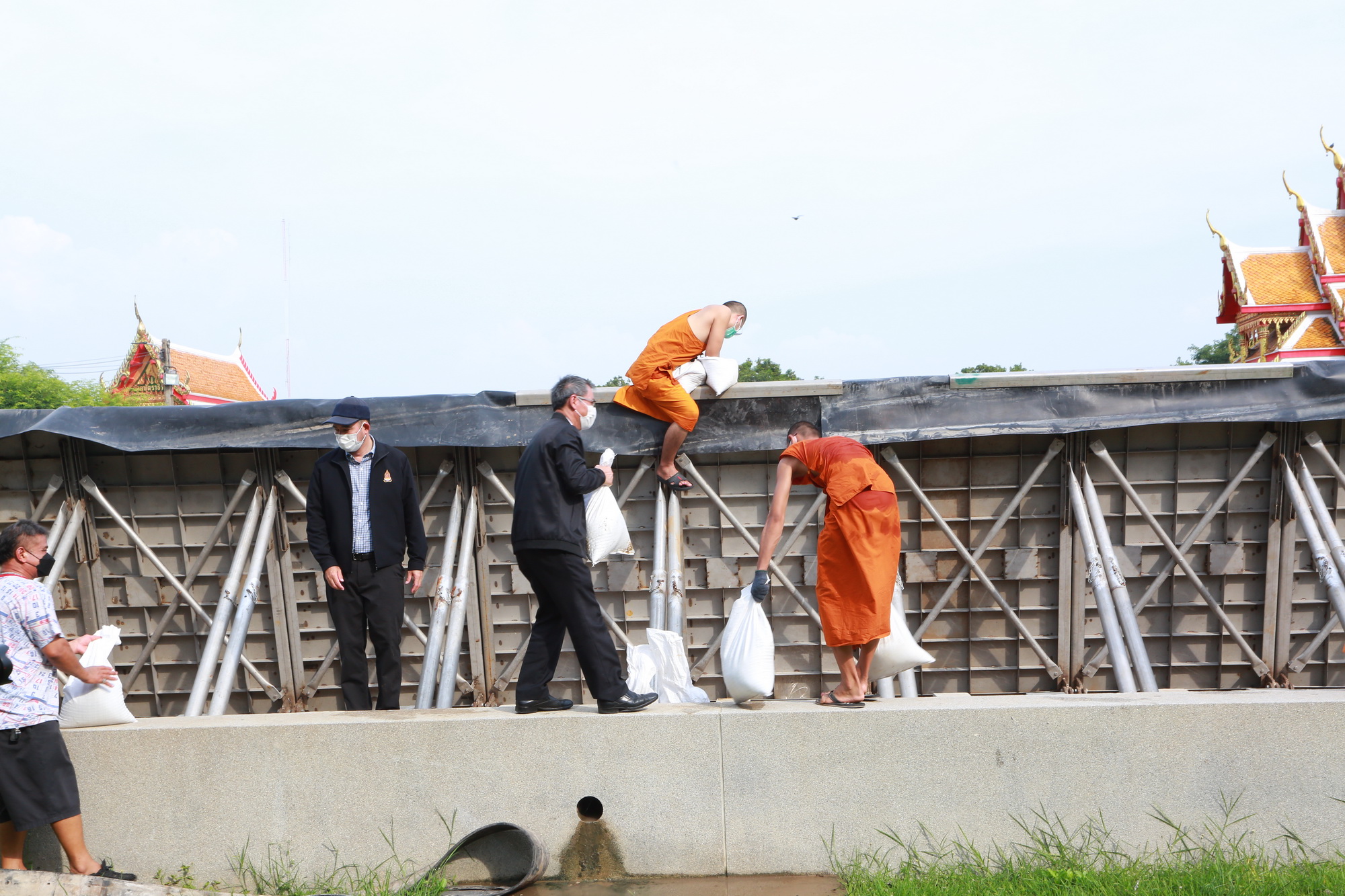 ๒. วัดกษัตราธิราชวรวิหาร ใช้วิธีการป้องกันน้ำท่วมโดยวิธีการตั้งแผงป้องกันน้ำท่วมรูปแบบที่สามารถ ยกตั้งขึ้นและพับเก็บได้ ป้องกันรอบเขตพุทธาวาสและเขตสังฆาวาสของวัด แนวป้องกันน้ำท่วมมีความยาวประมาณ ๓๐๘ เมตร สูงจากพื้นประมาณ ๑.๗๐ เมตร