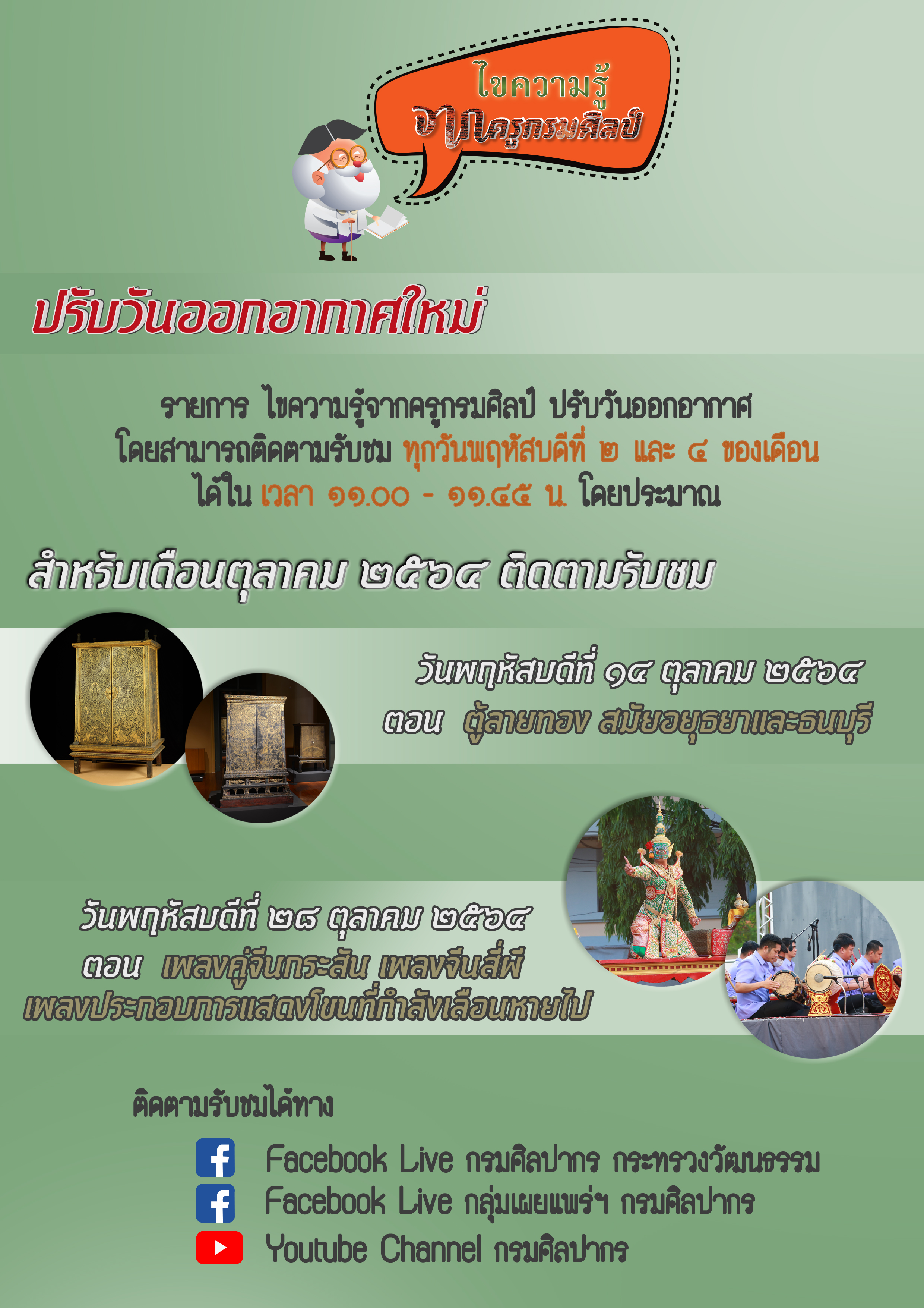 ขอเชิญชวนผู้สนใจ ติดตามชมรายการ “ไขความรู้จากครูกรมศิลป์” ถ่ายทอดสด (facebook live) ผ่านทาง facebook fanpage กรมศิลปากร กระทรวงวัฒนธรรม และกลุ่มเผยแพร่ฯ กรมศิลปากร ทุกวันพฤหัสบดีที่ ๒ และ ๔ ของเดือน เวลา ๑๑.๐๐ – ๑๑.๔๕ น.