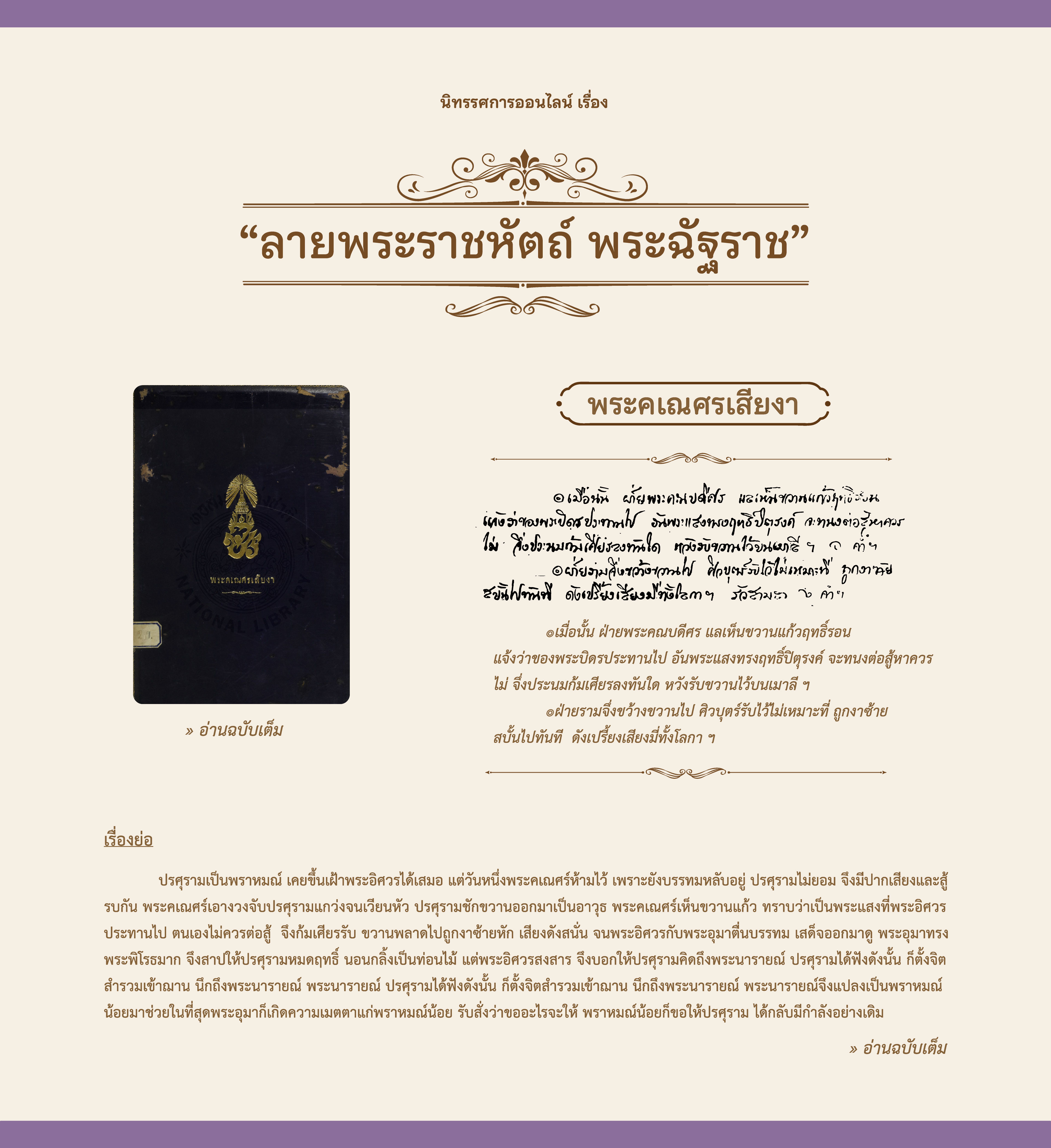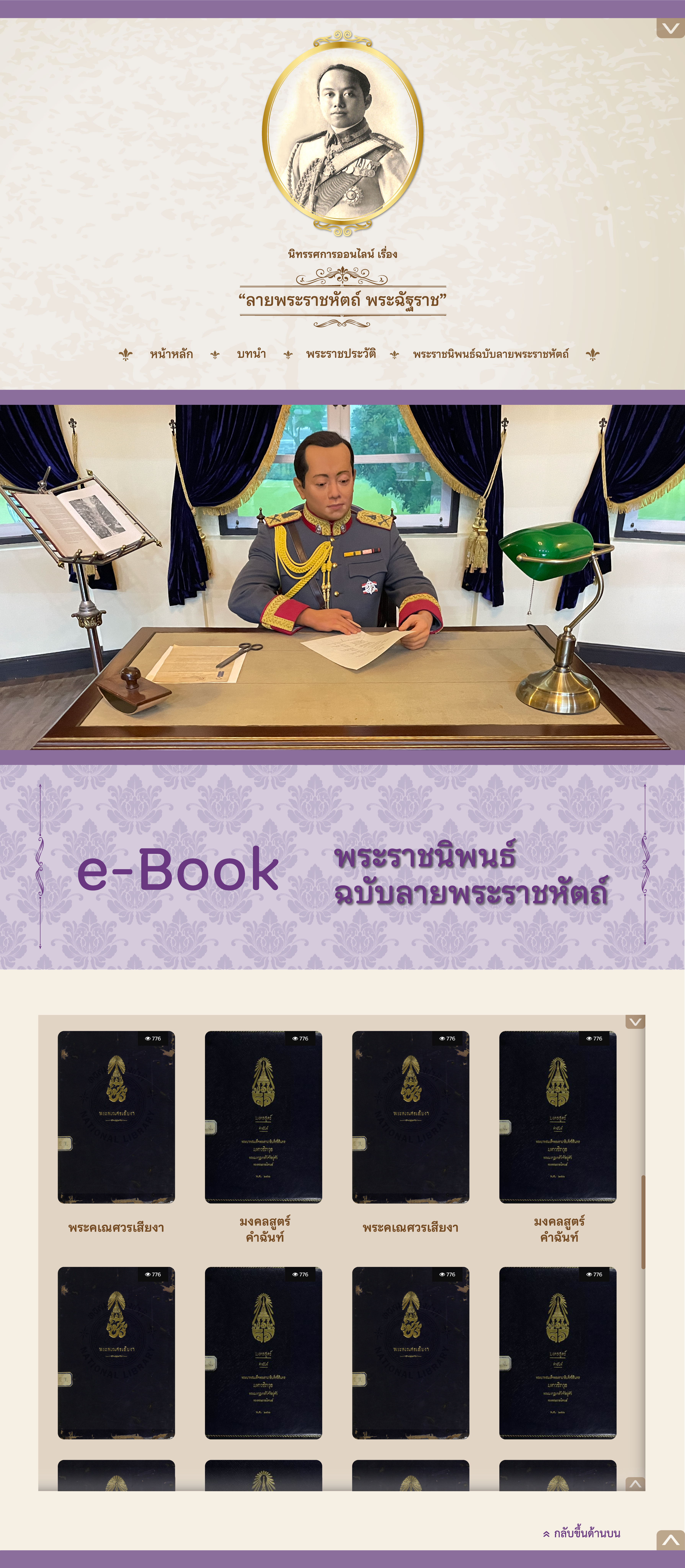กรมศิลปากร โดยสำนักหอสมุดแห่งชาติ ขอเชิญชมนิทรรศการออนไลน์ เรื่อง “ลายพระราชหัตถ์ พระฉัฐราช” เผยแพร่พระราชนิพนธ์ฉบับลายพระราชหัตถ์พระบาทสมเด็จพระมงกุฎเกล้าเจ้าอยู่หัว จำนวน ๗๘ เรื่อง ในรูปแบบ e-Book ที่เว็บไซต์ หอสมุดแห่งชาติ