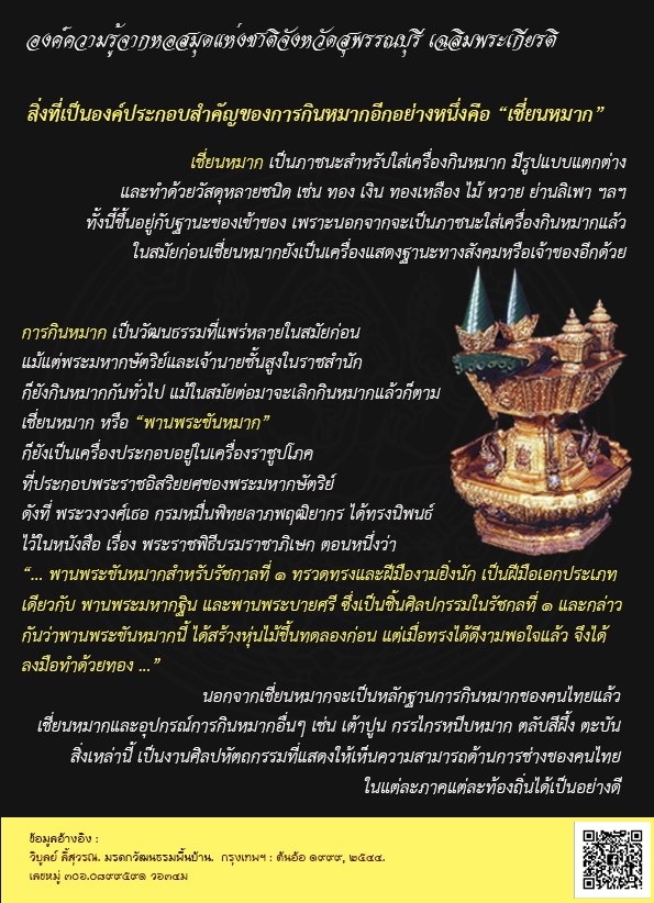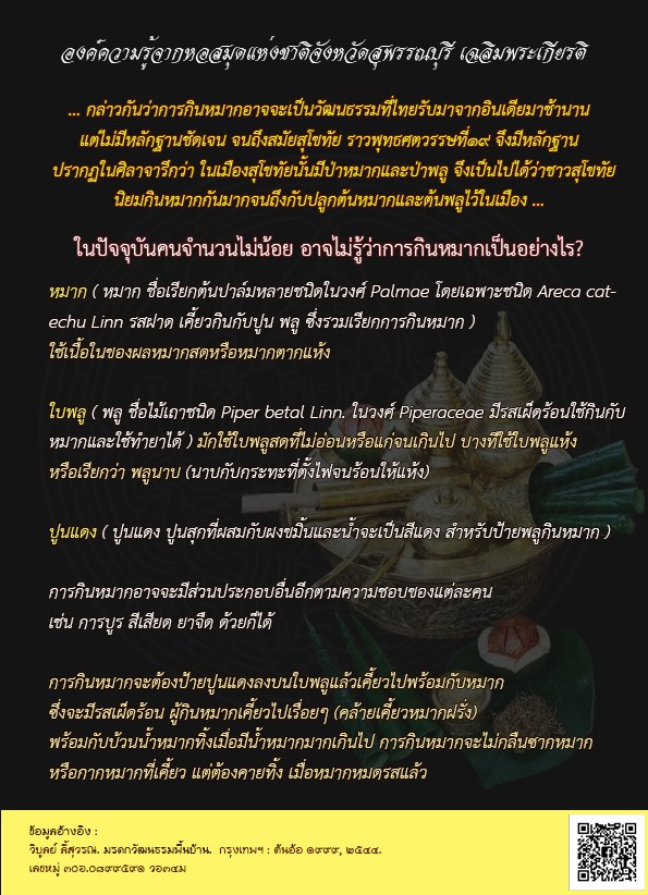 ... กล่าวกันว่าการกินหมากอาจจะเป็นวัฒนธรรมที่ไทยรับมาจากอินเดียมาช้านาน แต่ไม่มีหลักฐานชัดเจน จนถึงสมัยสุโขทัย ราวพุทธศตวรรษที่๑๙ จึงมีหลักฐานปรากฏในศิลาจารึกว่า ในเมืองสุโขทัยนั้นมีป่าหมากและป่าพลู จึงเป็นไปได้ว่าชาวสุโขทัยนิยมกินหมากกันมากจนถึงกับปลูกต้นหมากและต้นพลูไว้ในเมือง ในปัจจุบันคนจำนวนไม่น้อย อาจไม่รู้ว่าการกินหมากเป็นอย่างไร? หมาก ( หมาก ชื่อเรียกต้นปาล์มหลายชนิดในวงศ์ Palmae โดยเฉพาะชนิด Areca catechu Linn รสฝาด เคี้ยวกินกับปูน พลู ซึ่งรวมเรียกการกินหมาก ) ใช้เนื้อในของผลหมากสดหรือหมากตากแห้ง ใบพลู ( พลู ชื่อไม้เถาชนิด Piper betal Linn. ในวงศ์ Piperaceae มีรสเผ็ดร้อนใช้กินกับหมากและใช้ทำยาได้ ) มักใช้ใบพลูสดที่ไม่อ่อนหรือแก่จนเกินไป บางทีใช้ใบพลูแห้ง หรือเรียกว่าพลูนาบ (นาบกับกระทะที่ตั้งไฟจนร้อนให้แห้ง)