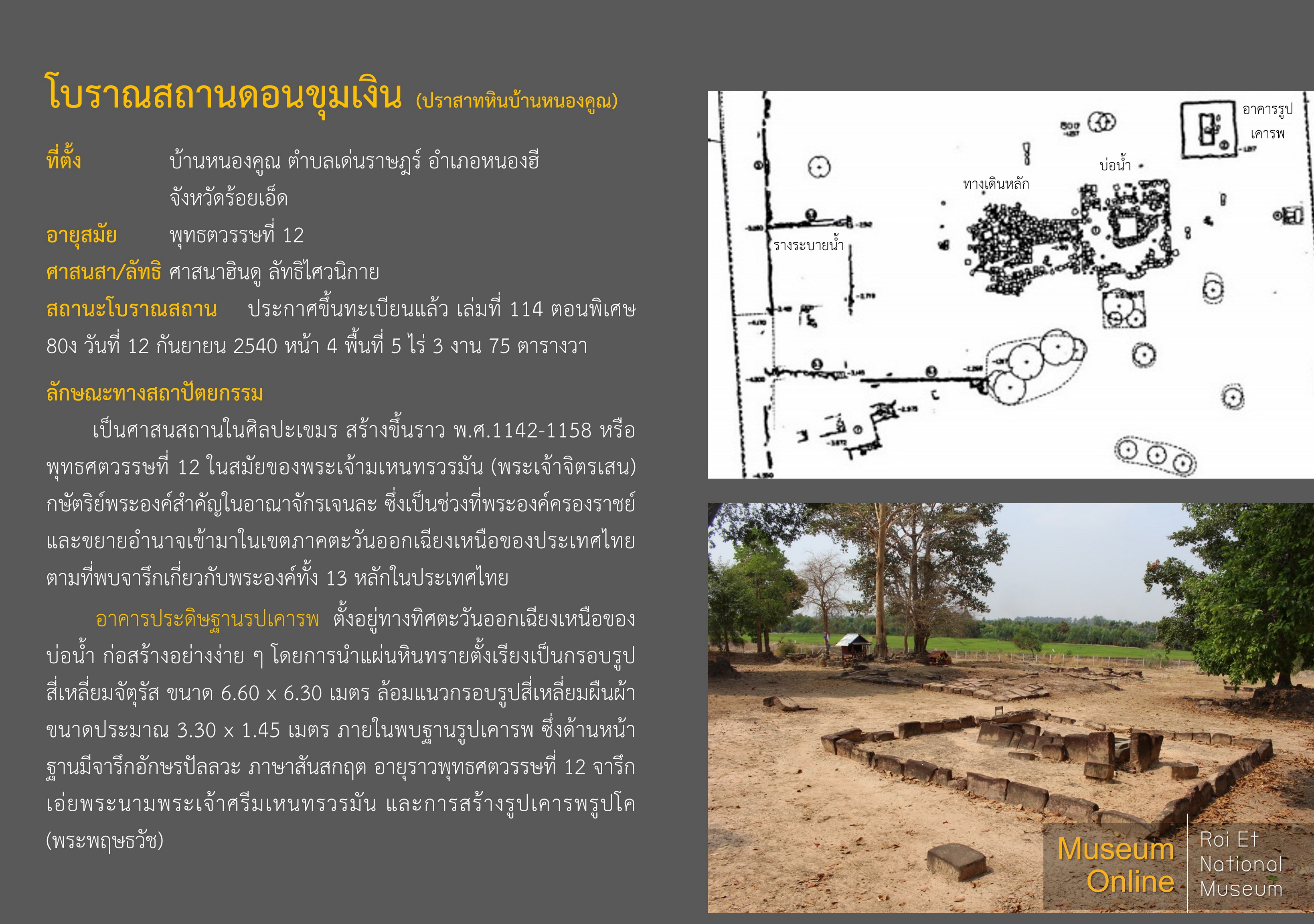 องค์ความรู้คู่พิพิธภัณฑ์ ของพิพิธภัณฑสถานแห่งชาติ ร้อยเอ็ด เรื่อง "ปราสาทเขมรในจังหวัดร้อยเอ็ดและโบราณวัตถุที่เกี่ยวข้อง" ตอน : โบราณสถานดอนขุมเงิน (ปราสาทหินบ้านหนองคูน)