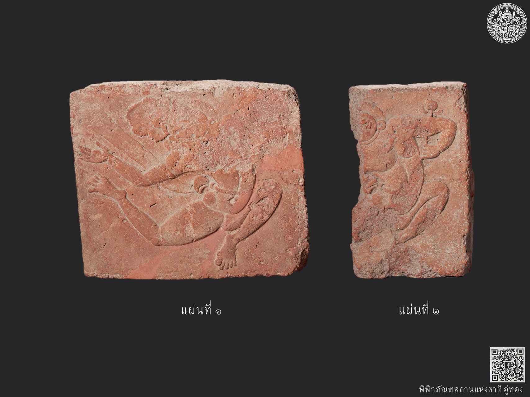 แผ่นดินเผาขนาดใหญ่ รูปทรงสี่เหลี่ยมผืนผ้า แผ่นที่ ๑ มีสภาพเกือบสมบูรณ์ กว้างประมาณ ๓๐ เซนติเมตร ยาว ๓๖ เซนติเมตร แผ่นที่ ๒ ชำรุดหักหายไปส่วนหนึ่ง กว้างประมาณ ๑๙ เซนติเมตร ยาว ๓๒ เซนติเมตร หากมีสภาพสมบูรณ์น่าจะมีรูปแบบเช่นเดียวกับแผ่นดินเผาแผ่นที่ ๑ แผ่นดินเผาทั้งสองแผ่นมีการตกแต่งผิวหน้าด้วยภาพนูนต่ำรูปบุคคลเหาะ สันนิษฐานว่าผลิตขึ้นโดยใช้เทคนิคการขึ้นรูปด้วยแม่พิมพ์แล้วนำไปเผา เพื่อให้ได้ประติมากรรมรูปแบบเดียวกันจำนวนหลายชิ้น มีร่องรอยแกลบข้าวในเนื้อดิน ซึ่งเป็นลักษณะเฉพาะของอิฐ หรือประติมากรรมดินเผาที่สร้างขึ้นในสมัยทวารวดี กำหนดอายุสมัยทวารวดี ราวพุทธศตวรรษที่ ๑๒ – ๑๔ (ประมาณ ๑,๒๐๐ – ๑,๔๐๐ ปีมาแล้ว)