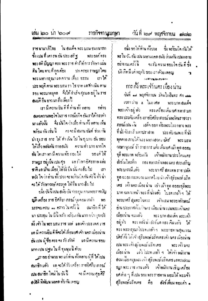 เนื้อความในประกาศเมื่อครั้งที่พระบาทสมเด็จพระจุลจอมเกล้าเจ้าอยู่หัว ทรงพระกรุณาโปรดเกล้าฯ พระราชทานพระสุพรรณบัฏ ความว่า “ศุภมัสดุ พระพุทธสาสนกาล เปนอดีตภาคล่วงแล้ว ๒๔๔๖ พรรษา ปัตยุบันกาลจันทรคตินิยม สะสะสังวัจฉระ กติกมาศ กาฬปักษ์ จตุทสีดิถีพุฒวาร สุริยคติกาล รัตนโกสินทรศก ๑๒๒ พฤศจิกายนมาศ อัฏฐารสมมาสาหคุณพิเศษ บริเฉทกาลกำหนด พระบาทสมเด็จพระปรมินทรมหาจุฬาลงกรณ์ บดินทรเทพยมหามงกุฎ บุรุษยรัตนราชรวิวงษ์ วรุตมพงษบริพัตร วรขัติยราชนิกโรดม จาตุรันตบรมมหาจักรพรรดิราชสังกาศ ฯลฯ ปรมินทรธรรมิกมหาราชาธิราช บรมนารถบพิตร์ พระจุลจอมเกล้าเจ้าอยู่หัว ทรงพระราชดำริห์ว่า เจ้าสุริยพงษ์ผริตเดชฯ เจ้านครเมืองน่าน ได้รับราชการสนองพระเดชพระคุณมาช้านาน แลได้เคยไปราชการทัพศึก มีบำเหน็จความชอบมาแต่ยังเปนตำแหน่งเจ้าราชวงษ์ในนครเมืองน่าน ครั้นเมื่อทรงพระกรุณาโปรดเกล้าฯ ตั้งให้เปนเจ้าผู้ครองนครเมืองน่าน ก็อุสาหปกครองบ้านเมืองต่างพระเนตร์พระกรรณ์โดยซื่อสัตย์สุจริต มีความโอบอ้อมอารี เปนที่นิยมนับถือของเจ้านายท้าวพระยา แลไพร่บ้านพลเมืองทั่วไปเปนอันมาก ทั้งมีความสวามิภักดิ์ต่อราชการเปนนิตย์ แม้มีราชการสำคัญเกิดขึ้นข้างฝ่ายเหนือคราวใด เจ้าสุริยพงษ์ผริตเดชฯ ก็ได้พร้อมใจกับเจ้านายบุตร์หลานช่วยราชการโดยแขงแรงทุกคราวมา จนเมื่อเกิดเหตุผู้ร้ายก่อการจลาจลขึ้นในมณฑลพายัพ เมื่อรัตนโกสินทรศก ๑๒๑ นี้ เจ้าสุริยพงษ์ผริตเดชฯ ก็ได้จัดเจ้านายบุตร์หลานแลท้าวพญาไพร่พลนครเมืองน่านช่วยปราบปรามผู้ร้าย แลเปนกำลังจัดเสบียงอาหารพาหนะส่งกองทหาร ได้รับราชการเปนที่พอพระราชหฤไทยเปนอันมาก อนึ่ง เจ้าสุริยพงษ์ผริตเดชฯ มีความจงรักภักดีต่อใต้ฝ่าลอองธุลีพระบาทโดยฉะเพาะ แม้อยู่เมืองไกล ก็มิได้คิดแก่ความลำบาก อุสาหฝ่าทางกันดารมาเฝ้าทูลลอองธุลีพระบาทเนือง ๆ ผิดกับเจ้านครเมืองน่านแต่ก่อน ๆ มา เปนเหตุให้ทรงพระกรุณาสนิทชิดชอบพระราชอัธยาไศรยเปนอันมาก ทรงพระราชดำริห์ว่า นครเมืองน่านก็เปนนครใหญ่อันหนึ่งในหัวเมืองประเทศราชข้าขอบขัณฑสิมา เจ้านายที่ปกครองนครเมืองน่านต่างพระเนตร์พระกรรณ์สืบตระกูลวงษ์ต่อ ๆ กันมา ยังหาได้มีเจ้าตนใดได้เคยรับพระราชทานเกียรติยศเปนพระเจ้าประเทศราชไม่ แลบัดนี้ เจ้าสุริยพงษ์ผริตเดช ก็เจริญชนม์ไวยยิ่งกว่าบรรดาเจ้าประเทศราชทั้งปวง ทั้งมีอัธยาไศรยเปนสัตย์ธรรมมั่นคง จงรักภักดีต่อใต้ฝ่าลอองธุลีพระบาทเนืองนิจ แลมีความชอบความดีมาในราชการเปนอันมาก สมควรจะทรงพระกรุณาโปรดเกล้าฯ ยกย่