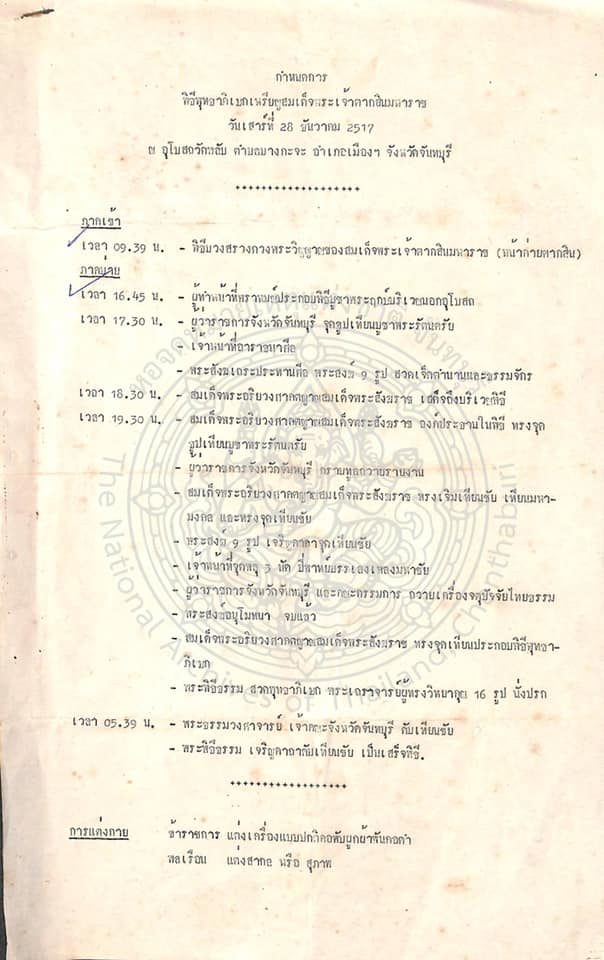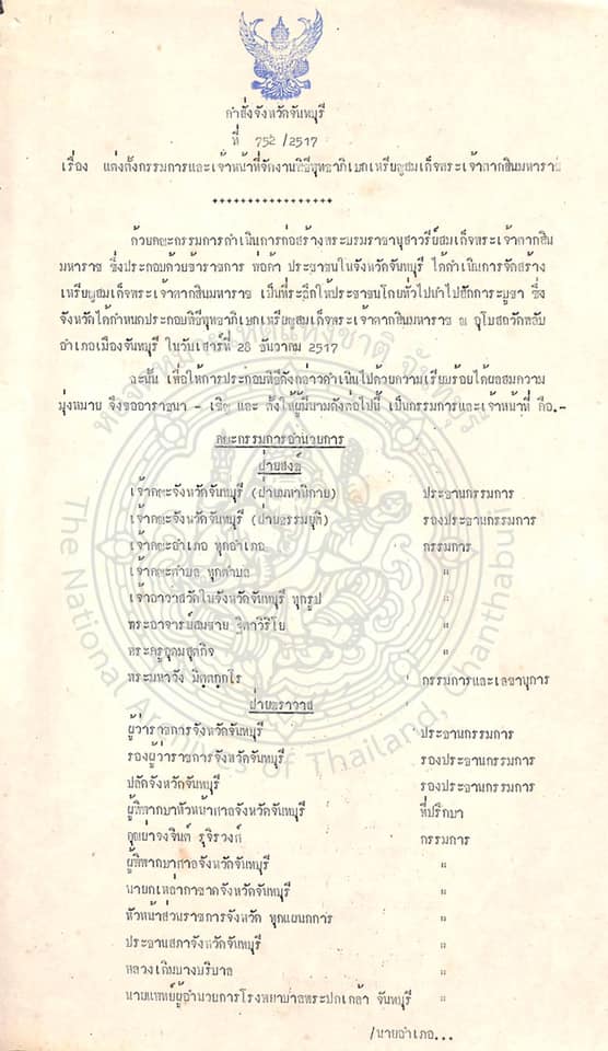 /// อ้างอิง หอจดหมายเหตุแห่งชาติจันทบุรี. จบ1.1.1.6/49 เอกสารชุดจังหวัดจันทบุรี ส่วนแผนกมหาดไทย. เรื่องพิธีพุทธาภิเษกเหรียญสมเด็จพระเจ้าตากสินมหาราช (13 – 28 ธันวาคม 2517)