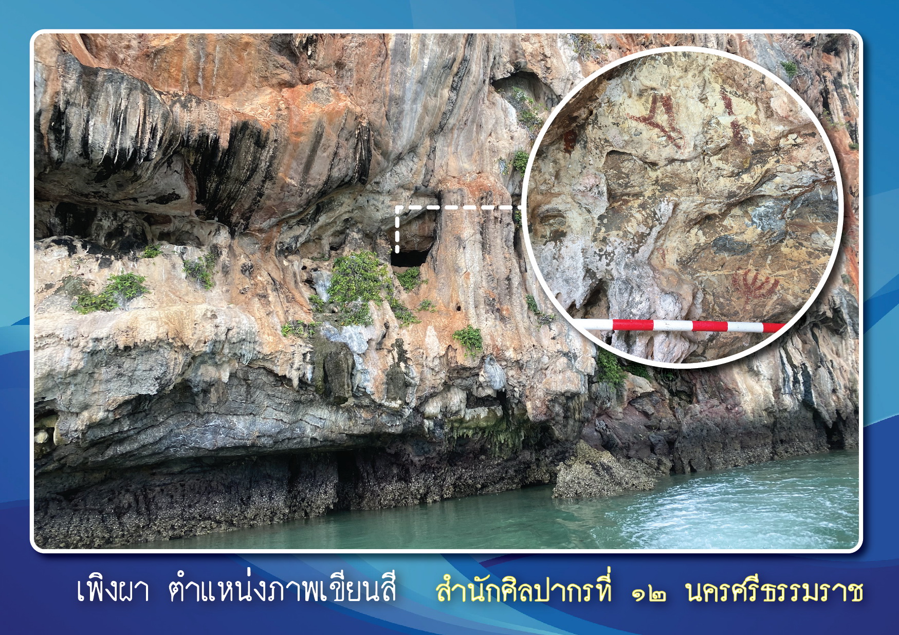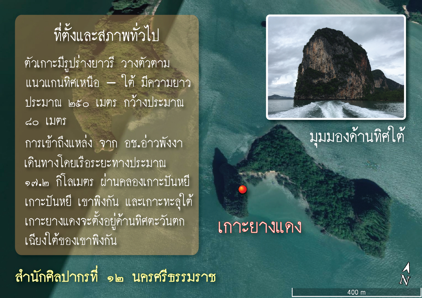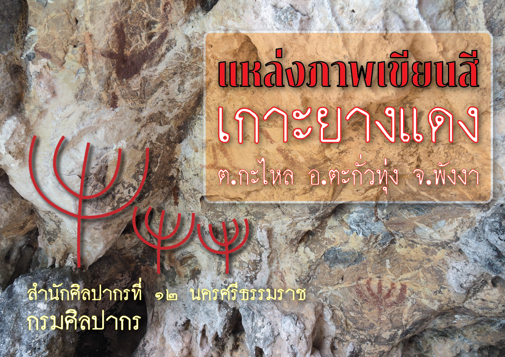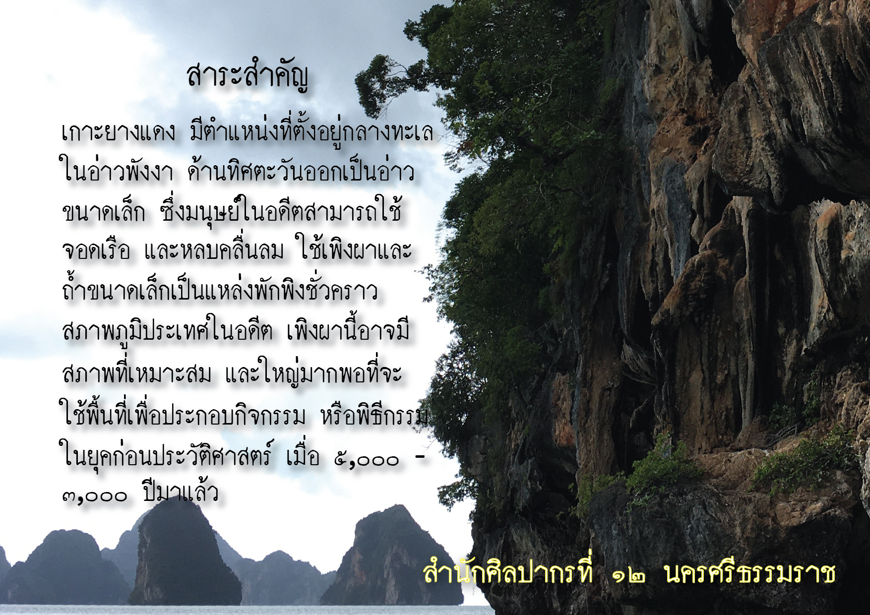 ...เกาะต่างๆ ในอ่าวพังงา ที่เราแล่นเรือผ่านนั้น หากสังเกตบริเวณผนังเพิงผาหรือถ้ำ อาจพบภาพเขียนสีหรือศิลปะถ้ำ ที่มนุษย์ในอดีตได้เขียนหรือวาดเอาไว้ เมื่อครั้งที่แวะเข้ามาพักพิงและใช้พื้นที่เพื่อวัตถุประสงค์ในหลายๆประการ ที่เกาะยางแดงแห่งนี้ แม้จะไม่ปรากฏภาพบุคคลและสัตว์ประเภทต่างๆ ดังที่พบที่เกาะอื่นๆ แต่ที่นี่ปรากฏภาพที่อาจสื่อถึงพืชพันธุ์ธรรมชาติที่อาจเกี่ยวข้องกับวิถีชีวิตของมนุษย์ในยุคนั้นได้...