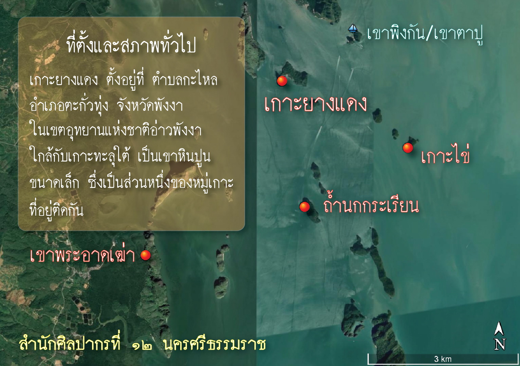 แหล่งภาพเขียนสีเกาะยางแดง ตั้งอยู่ที่ ตำบลกะไหล อำเภอตะกั่วทุ่ง จังหวัดพังงา ในเขตอุทยานแห่งชาติอ่าวพังงา อยู่บนเกาะซึ่งไม่ปรากฏชื่อในแผนที่ทหาร ใกล้กับเกาะทะลุใต้ เป็นเขาหินปูนขนาดเล็ก ซึ่งเป็นส่วนหนึ่งของหมู่เกาะที่อยู่ติดกัน ตัวเกาะมีรูปร่างยาวรี วางตัวตามแนวแกนทิศเหนือ – ใต้ มีความยาวประมาณ ๒๕๐ เมตร กว้างประมาณ ๘๐ เมตร