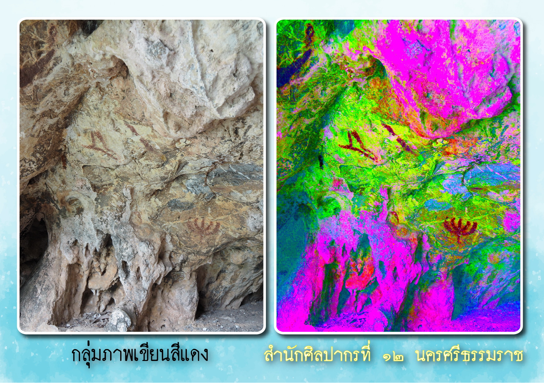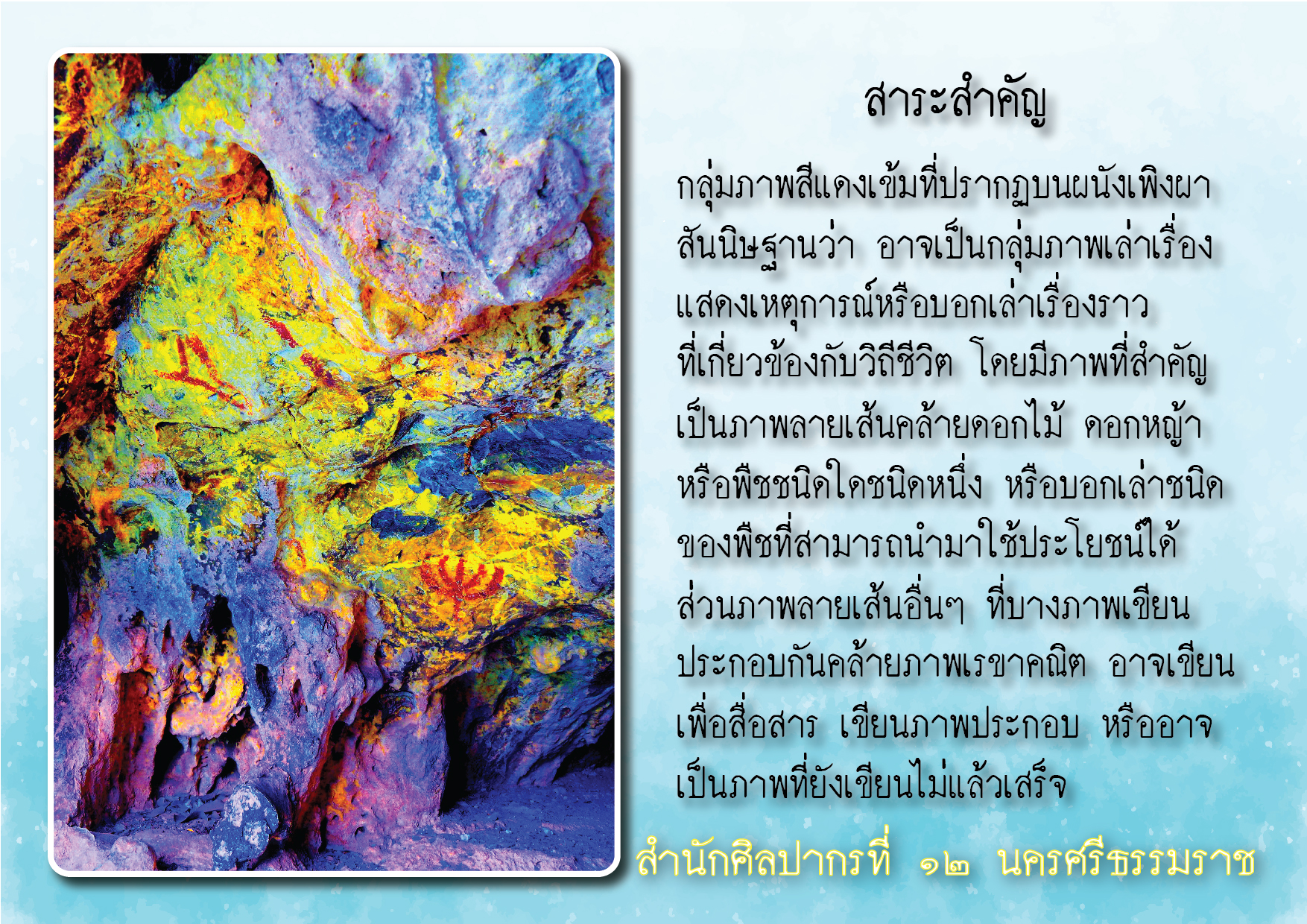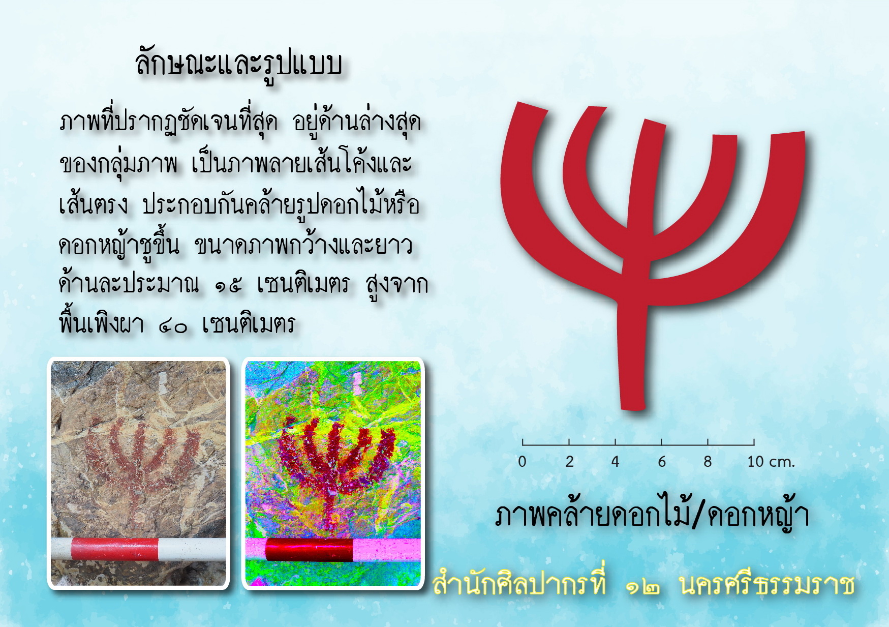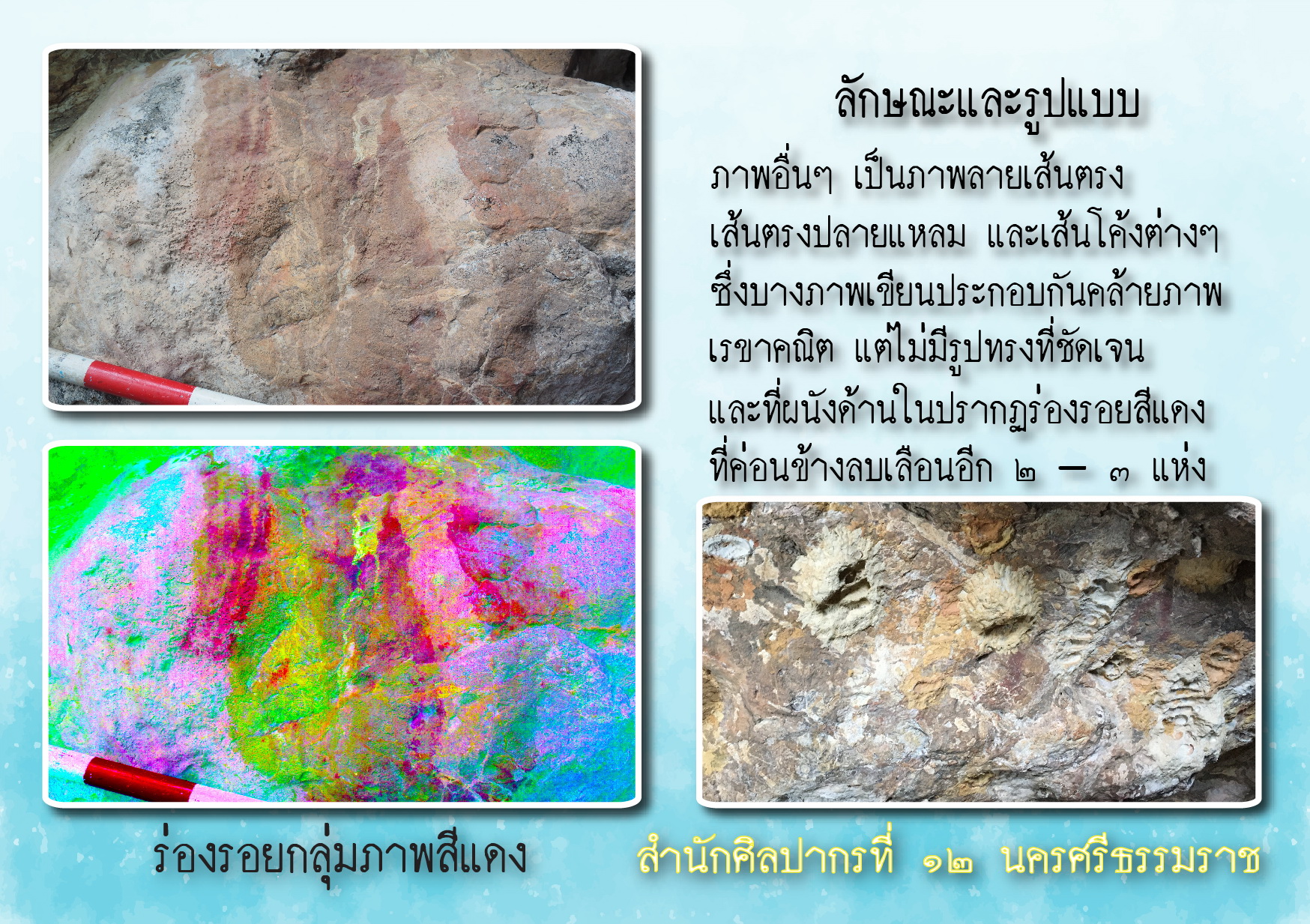 ภาพที่ปรากฏชัดเจนเป็นกลุ่มภาพลายเส้นสีแดงเข้ม มีจำนวน ๕ – ๖ ภาพ อยู่ใกล้กัน ขนาดกลุ่มภาพโดยรวมกว้างประมาณ ๑๐๐ เซนติเมตร สูงประมาณ ๖๐ –๗๐ เซนติเมตร