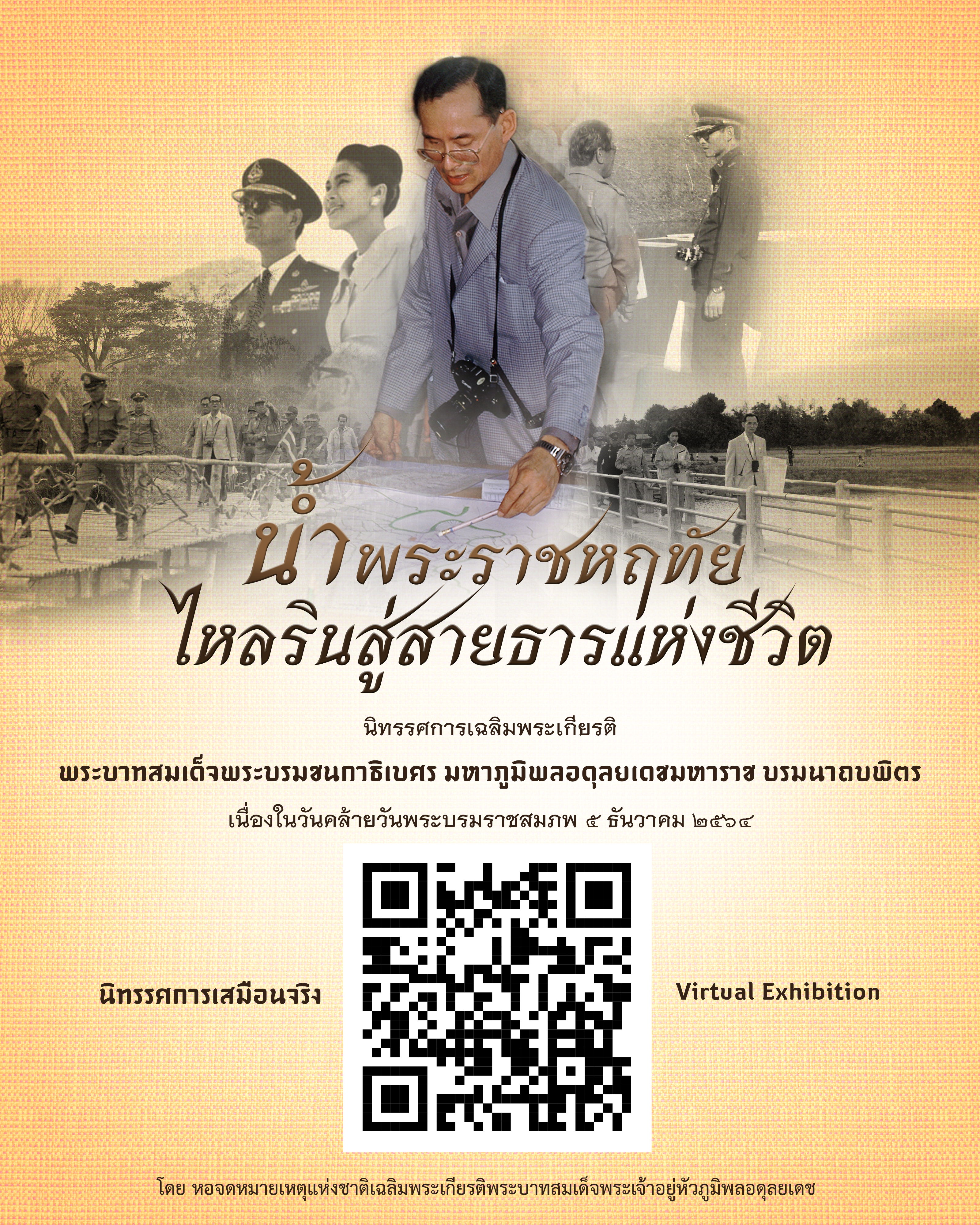 หอจดหมายเหตุแห่งชาติเฉลิมพระเกียรติพระบาทสมเด็จพระเจ้าอยู่หัวภูมิพลอดุลยเดช ขอเชิญชมนิทรรศการเสมือนจริง เรื่อง "น้ำพระราชหฤทัย ไหลรินสู่สายธารแห่งชีวิต" เนื่องในวันคล้ายวันพระบรมราชสมภพพระบาทสมเด็จพระบรมชนกาธิเบศร มหาภูมิพลอดุลยเดชมหาราช บรมนาถบพิตร วันที่ ๕ ธันวาคม พุทธศักราช ๒๕๖๔ จัดแสดงพระราชกรณียกิจเกี่ยวกับการพัฒนาแหล่งน้ำเพื่อการอุปโภค บริโภค เพื่อการทำการเกษตร และเพื่อบรรเทาสาธารณภัย เข้าสู่นิทรรศการเสมือนจริงได้ที่ https://king-bhumibol-exhibition.web.app/