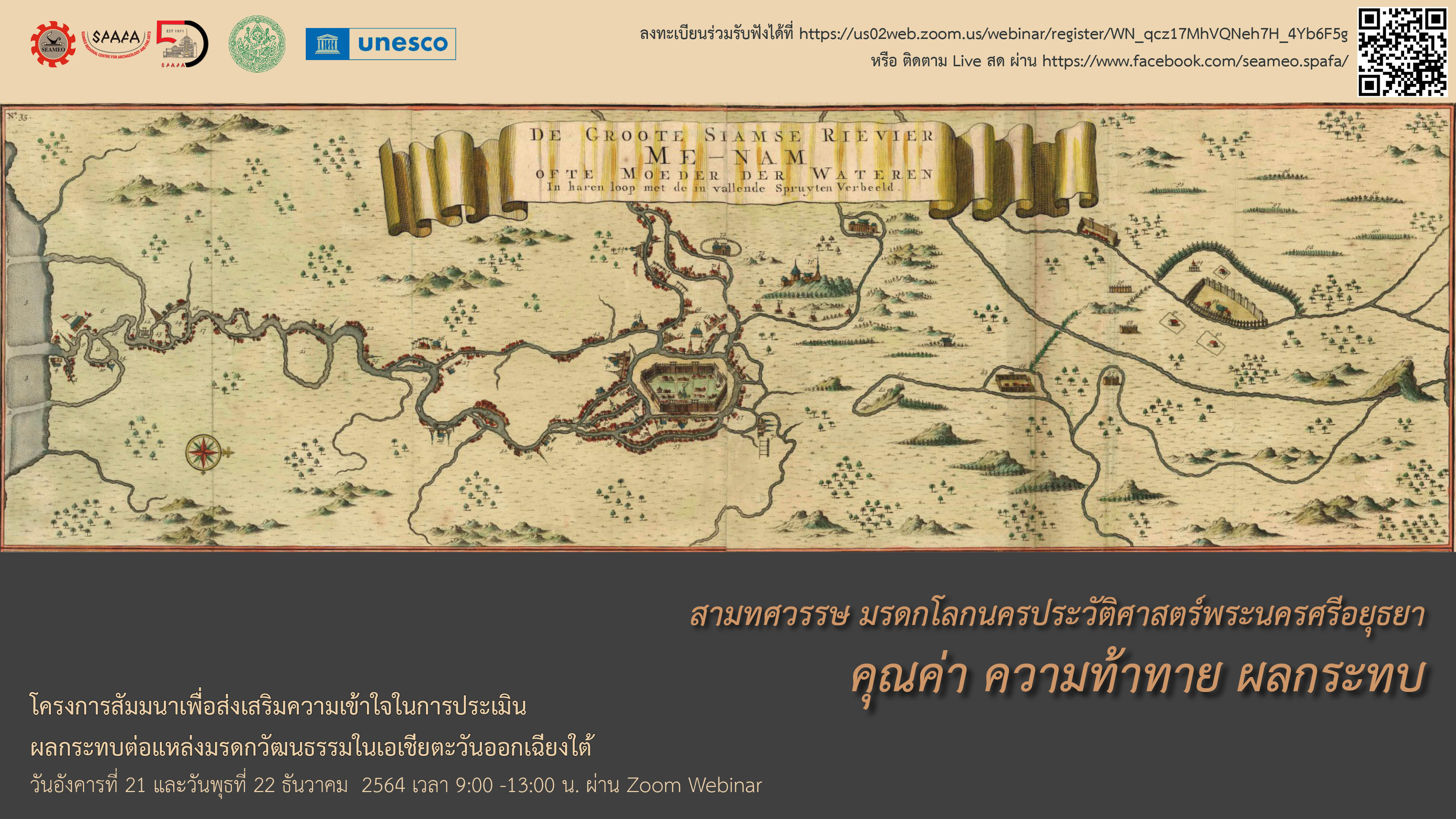 ขอเชิญร่วมการสัมมนาวิชาการออนไลน์ “สามทศวรรษ มรดกโลกนครประวัติศาสตร์พระนครศรีอยุธยา คุณค่า ความท้าทาย และผลกระทบ” ผ่านระบบ ZOOM