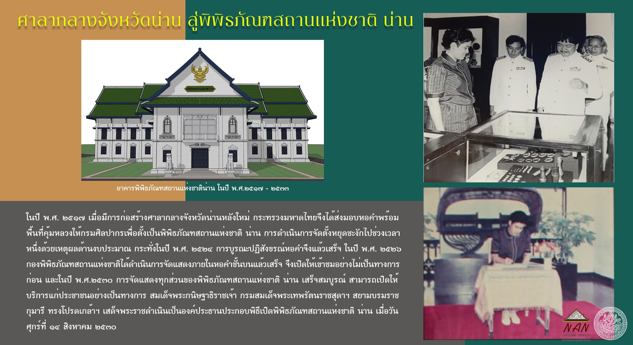 -----กระทั่ง การดำเนินงานจัดแสดงทุกส่วนของพิพิธภัณฑสถานแห่งชาติ น่าน เสร็จสมบูรณ์ สามารถเปิดให้บริการแก่ประชาชนอย่างเป็นทางการ สมเด็จพระกนิษฐาธิราชเจ้า กรมสมเด็จพระเทพรัตนราชสุดาฯ สยามบรมราชกุมารี ทรงโปรดเกล้าฯ เสด็จพระราชดำเนินเป็นองค์ประธานประกอบพิธีเปิดพิพิธภัณฑสถานแห่งชาติ น่าน เมื่อวันที่ ๑๔ สิงหาคม ๒๕๓๐