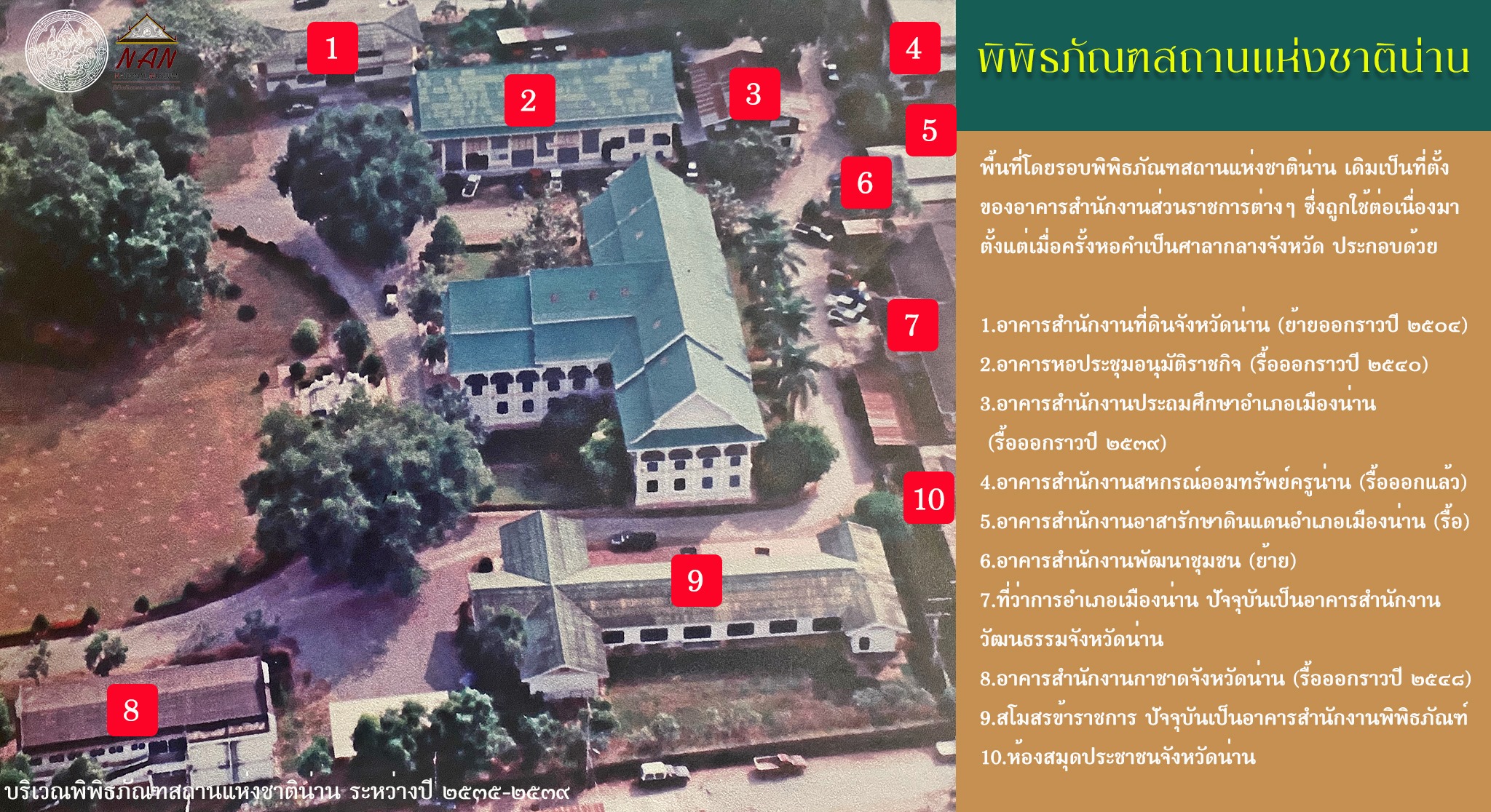 -----กระทั่ง พ.ศ. ๒๕๑๗ เมื่อมีการก่อสร้างศาลากลางจังหวัดน่านหลังใหม่ กระทรวงมหาดไทยจึงได้ส่งมอบหอคำ พร้อมพื้นที่คุ้มหลวงให้กรมศิลปากร เพื่อตั้งเป็นพิพิธภัณฑสถานแห่งชาติ น่าน