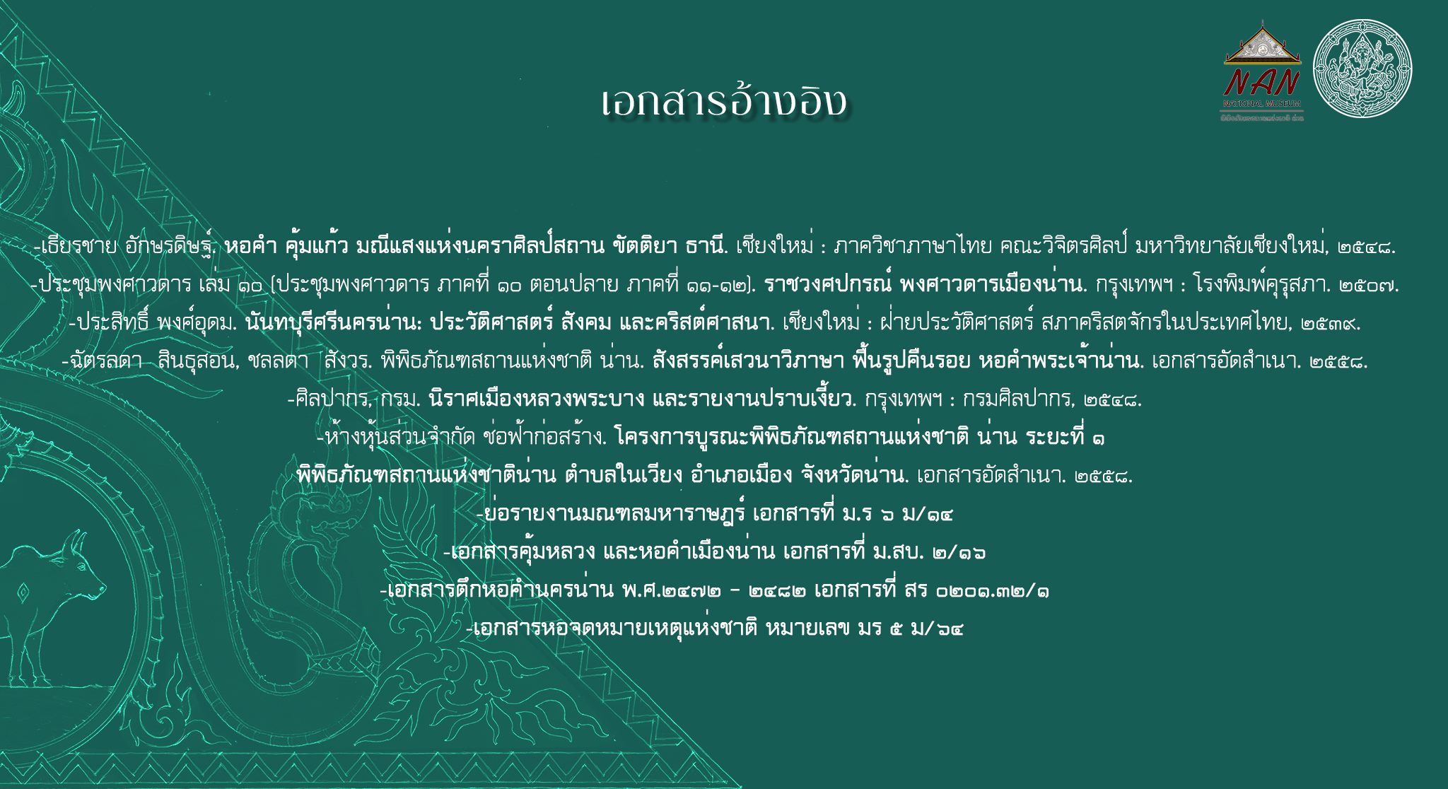 -ห้างหุ้นส่วนจำกัด ช่อฟ้าก่อสร้าง. โครงการบูรณะพิพิธภัณฑสถานแห่งชาติ น่าน ระยะที่ ๑ พิพิธภัณฑสถานแห่งชาติน่าน ตำบลในเวียง อำเภอเมือง จังหวัดน่าน. เอกสารอัดสำเนา. ๒๕๕๘.