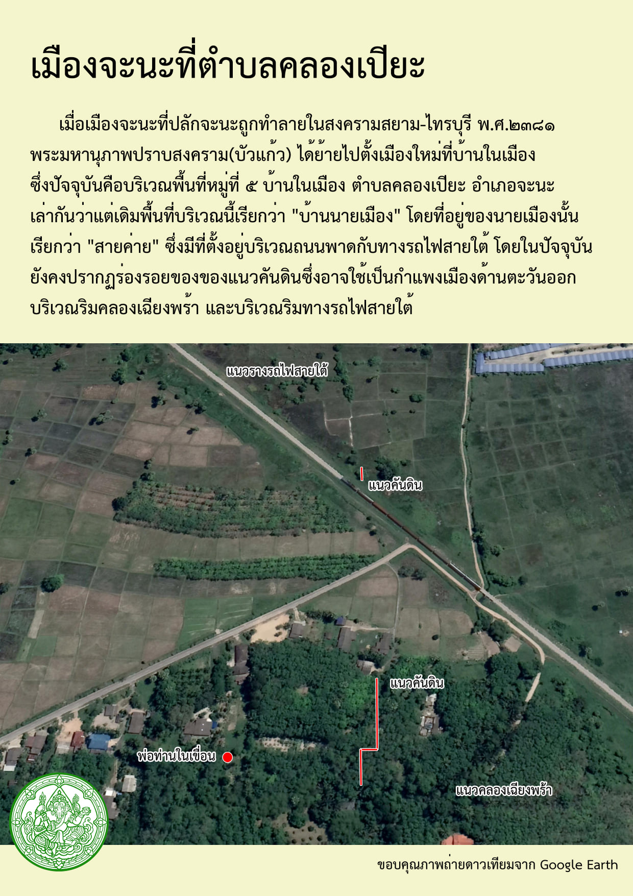 เมื่อเมืองจะนะที่ปลักจะนะถูกทำลายในสงครามสยาม-ไทรบุรี พ.ศ.๒๓๘๑ พระมหานุภาพปราบสงคราม(บัวแก้ว) ได้ย้ายไปตั้งเมืองใหม่ที่บ้านในเมือง ซึ่งปัจจุบันคือบริเวณพื้นที่หมู่ที่ ๕ บ้านในเมือง ตำบลคลองเปียะ อำเภอจะนะ เล่ากันว่าแต่เดิมพื้นที่บริเวณนี้เรียกว่า "บ้านนายเมือง" โดยที่อยู่ของนายเมืองนั้นเรียกว่า "สายค่าย" ซึ่งมีที่ตั้งอยู่บริเวณถนนพาดกับทางรถไฟสายใต้ โดยในปัจจุบันยังคงปรากฏร่องรอยของของแนวคันดินซึ่งอาจใช้เป็นกำแพงเมืองด้านตะวันออก บริเวณริมคลองเฉียงพร้า และบริเวณริมทางรถไฟสายใต้