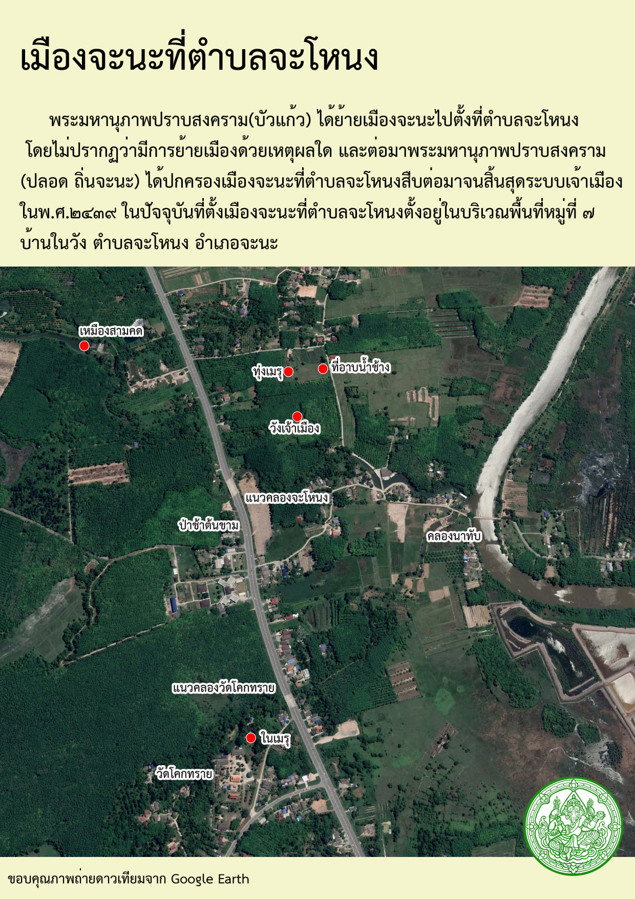 พระมหานุภาพปราบสงคราม(บัวแก้ว) ได้ย้ายเมืองจะนะไปตั้งที่ตำบลจะโหนง โดยไม่ปรากฏว่ามีการย้ายเมืองด้วยเหตุผลใด และต่อมาพระมหานุภาพปราบสงคราม(ปลอด ถิ่นจะนะ) ได้ปกครองเมืองจะนะที่ตำบลจะโหนงสืบต่อมาจนสิ้นสุดระบบเจ้าเมืองในพ.ศ.๒๔๓๙ ในปัจจุบันที่ตั้งเมืองจะนะที่ตำบลจะโหนงตั้งอยู่ในบริเวณพื้นที่หมู่ที่ ๗ บ้านในวัง ตำบลจะโหนง อำเภอจะนะ ร่องรอยหลักฐานที่ปรากฏอยู่ได้แก่
