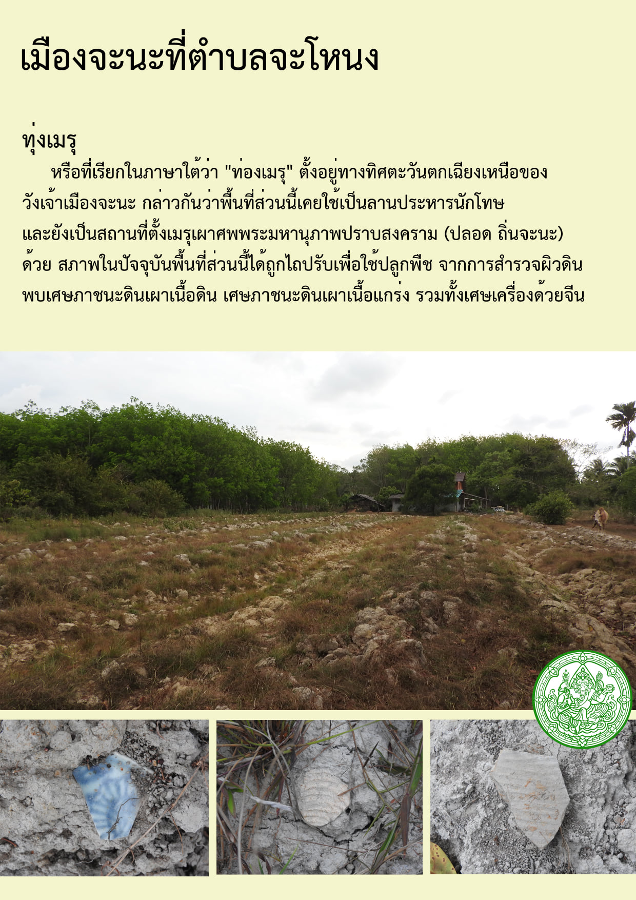 ๒.ทุ่งเมรุ หรือที่เรียกในภาษาใต้ว่า "ท่องเมรุ" ตั้งอยู่ทางทิศตะวันตกเฉียงเหนือของวังเจ้าเมืองจะนะ กล่าวกันว่าพื้นที่ส่วนนี้เคยใช้เป็นลานประหารนักโทษ และยังเป็นสถานที่ตั้งเมรุเผาศพพระมหานุภาพปราบสงคราม (ปลอด ถิ่นจะนะ) ด้วย สภาพในปัจจุบันพื้นที่ส่วนนี้ได้ถูกไถปรับเพื่อใช้ปลูกพืช จากการสำรวจผิวดินพบเศษภาชนะดินเผาเนื้อดิน เศษภาชนะดินเผาเนื้อแกร่ง รวมทั้งเศษเครื่องด้วยจีน