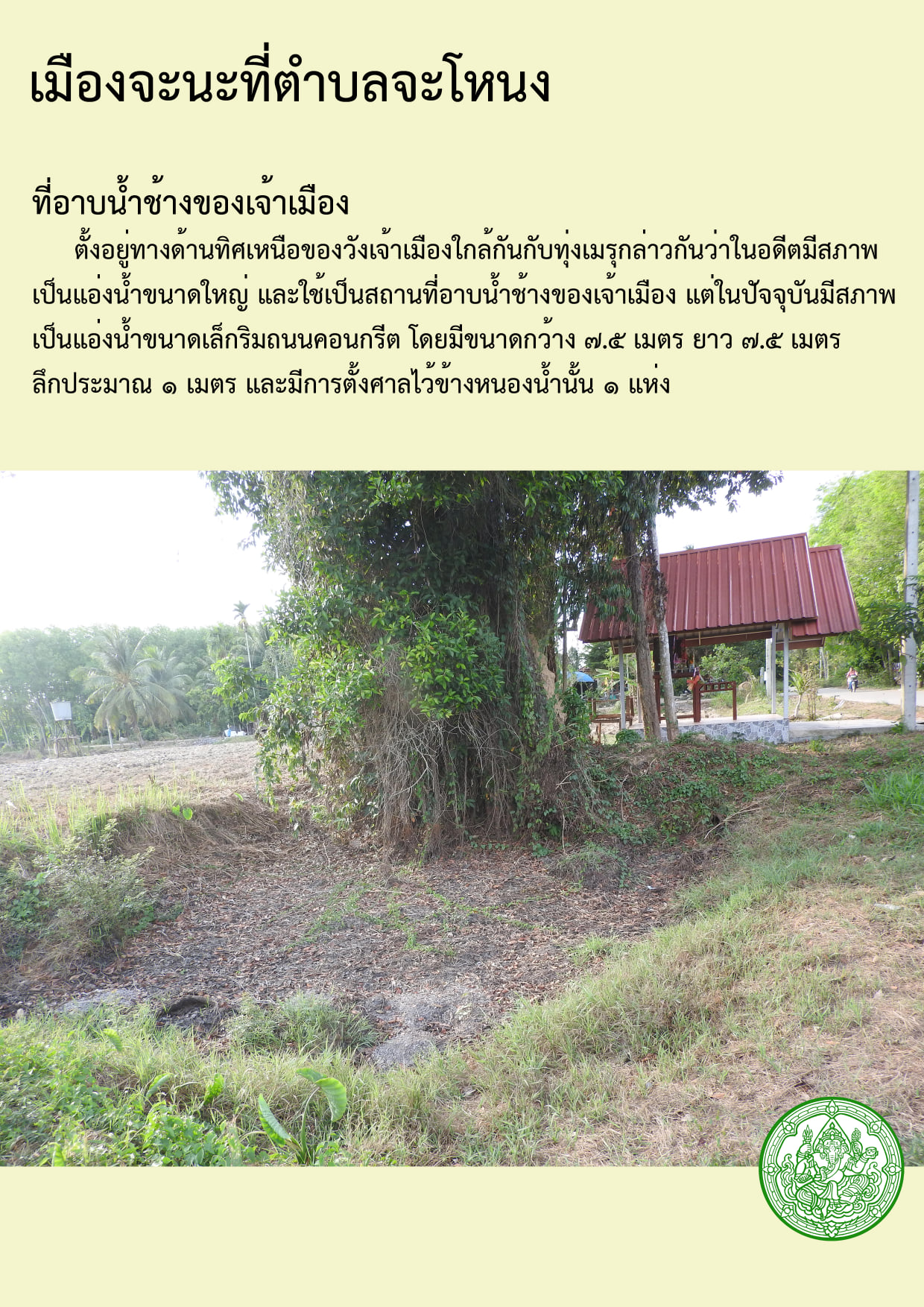 ๓.ที่อาบน้ำช้างของเจ้าเมือง ตั้งอยู่ทางด้านทิศเหนือของวังเจ้าเมืองใกล้กันกับทุ่งเมรุกล่าวกันว่าในอดีตมีสภาพเป็นแอ่งน้ำขนาดใหญ่ และใช้เป็นสถานที่อาบน้ำช้างของเจ้าเมือง แต่ในปัจจุบันมีสภาพเป็นแอ่งน้ำขนาดเล็กริมถนนคอนกรีต โดยมีขนาดกว้าง ๗.๕ เมตร ยาว ๗.๕ เมตร ลึกประมาณ ๑ เมตร และมีการตั้งศาลไว้ข้างหนองน้ำนั้น ๑ แห่ง