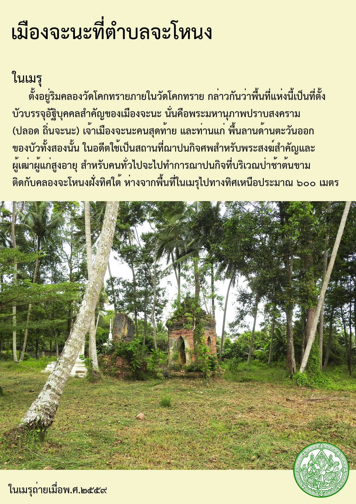 ๔.ในเมรุ ตั้งอยู่ริมคลองวัดโคกทรายภายในวัดโคกทราย กล่าวกันว่าพื้นที่แห่งนี้เป็นที่ตั้งบัวบรรจุอัฐิบุคคลสำคัญของเมืองจะนะ นั่นคือพระมหานุภาพปราบสงคราม(ปลอด ถิ่นจะนะ) เจ้าเมืองจะนะคนสุดท้าย และท่านแก่พื้นลานด้านตะวันออกของบัวทั้งสองนั้น ในอดีตใช้เป็นสถานที่ฌาปนกิจศพสำหรับพระสงฆ์สำคัญและผู้เฒ่าผู้แก่สูงอายุ สำหรับคนทั่วไปจะไปทำการฌาปนกิจที่บริเวณป่าช้าต้นขามติดกับคลองจะโหนงฝั่งทิศใต้ ห่างจากพื้นที่ในเมรุไปทางทิศเหนือประมาณ ๖๐๐ เมตร
