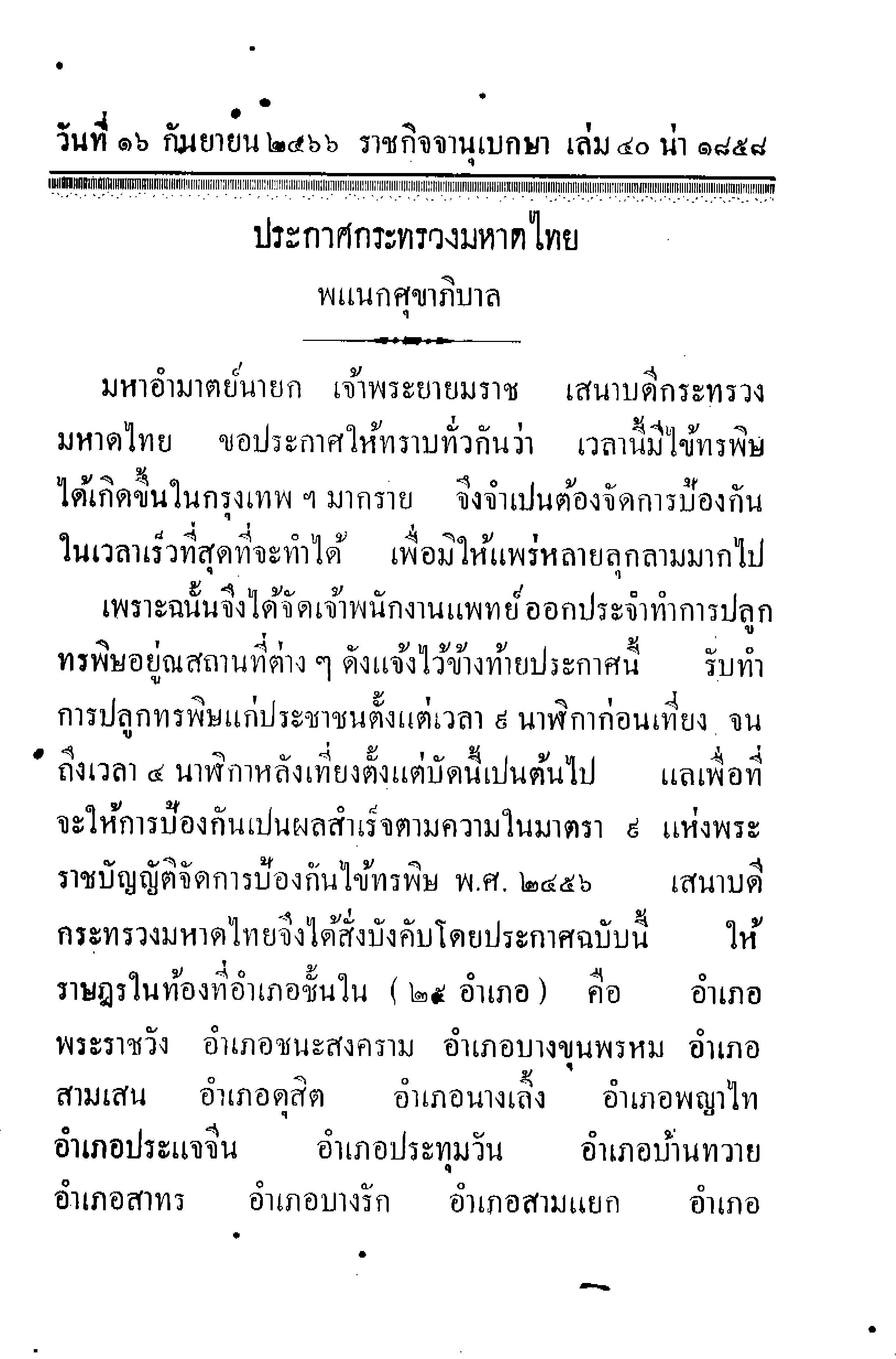 จรรยา ยุทธพลนาวี. อ่านเรื่อง อ่านโรค ตอนที่ 2 ประวัติศาสตร์และวัฒนธรรมการจัดการโรคระบาดใน สังคม. [ออนไลน์]. สืบค้นเมื่อ 10 มิถุนายน 2564,จาก: https://www.sac.or.th/main/th/article/detail/127. 2563. บีช แบรดลีย์, แดน. ตำราปลูกฝีโค ให้กันโรคธระพิศม์ไม่ให้ขึ้นได้. พิมพ์ครั้งที่ 2. กรุงเทพฯ: เอบีซีเอฟเอ็ม เพรส, 2387. “ประกาศกระทรวงมหาดไทย พแนกศุขาภิบาล” ราชกิจจานุเบกษา เล่ม 40 (16 กันยายน 2466) 1858. “ประกาศกระทรวงสาธารณสุข เรื่อง ชื่อและอาการสำคัญของโรคติดต่ออันตราย (ฉบับที่ ๓) พ.ศ. ๒๕๖๓” ราชกิจจานุเบกษา เล่ม 137 ตอนพิเศษ 48 ง (29 กุมภาพันธ์ 2563) 1. รณดล นุ่มนนท์. วัคซีนเข็มแรก ช่วยมนุษย์ พ้นวิกฤตการณ์โรคระบาด. [ออนไลน์]. สืบค้นเมื่อ 10 มิถุนายน 2564,จาก: https://www.prachachat.net/columns/news-671766. 2564. วัคซีนเข็มแรกของโลก วัคซีนเข็มแรกของไทย เกิดขึ้นเมื่อใด. [ออนไลน์]. สืบค้นเมื่อ 10 มิถุนายน 2564,จาก: https://www.silpa-mag.com/history/article_60861. 2564. ศรัณย์ ทองปาน. สยามยามเผชิญโรคระบาด. สืบค้นจาก [ออนไลน์]. สืบค้นเมื่อ 10 มิถุนายน 2564,จาก: https://ngthai.com/history/31993/siampandemic/. 2563. หมอบรัดเลย์ และความสำเร็จของการปลูกฝี ไข้ทรพิษ ครั้งแรกในสยาม. [ออนไลน์]. สืบค้นเมื่อ 10 มิถุนายน 2564,จาก: https://www.sarakadeelite.com/faces/dr-dan-beach-bradley/. อภิสิทธิ์ เรือนมูล. คน วัว และวัคซีน: เอ็ดเวิร์ด เจนเนอร์ บิดาแห่งวิทยาภูมิคุ้มกัน. [ออนไลน์]. สืบค้นเมื่อ 10 มิถุนายน 2564,จาก: https://waymagazine.org/humans-vacca-vaccines/. 2564.