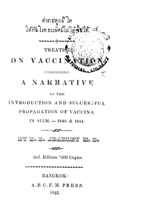 ในเดือนธันวาคม พ.ศ. 2385 หมอบรัดเลย์ได้เขียน “ตำราปลูกฝีโค” ถวายรัชกาลที่ 3 และตีพิมพ์เผยแพร่ในหนังสือจดหมายเหตุ บางกอกรีคอร์เดอร์ (หนังสือพิมพ์ฉบับแรกในสยาม) ต่อมาในปี พ.ศ. 2387 “ตำราปลูกฝีโค ให้กันโรคธระพิศม์ไม่ให้ขึ้นได้” โดยหมอบรัดเลย์ถูกตีพิมพ์เป็นหนังสือเล่มครั้งแรก จำนวน 500 เล่ม และพิมพ์ซ้ำครั้งที่ 2 อีก 1,000 เล่ม ในปีเดียวกัน จากความสำเร็จของการปลูกฝีไข้ทรพิษทำให้หมอบรัดเลย์ได้ชื่อว่าเป็นผู้ริเริ่ม “วิชาเวชศาสตร์ป้องกัน” ในประเทศไทย