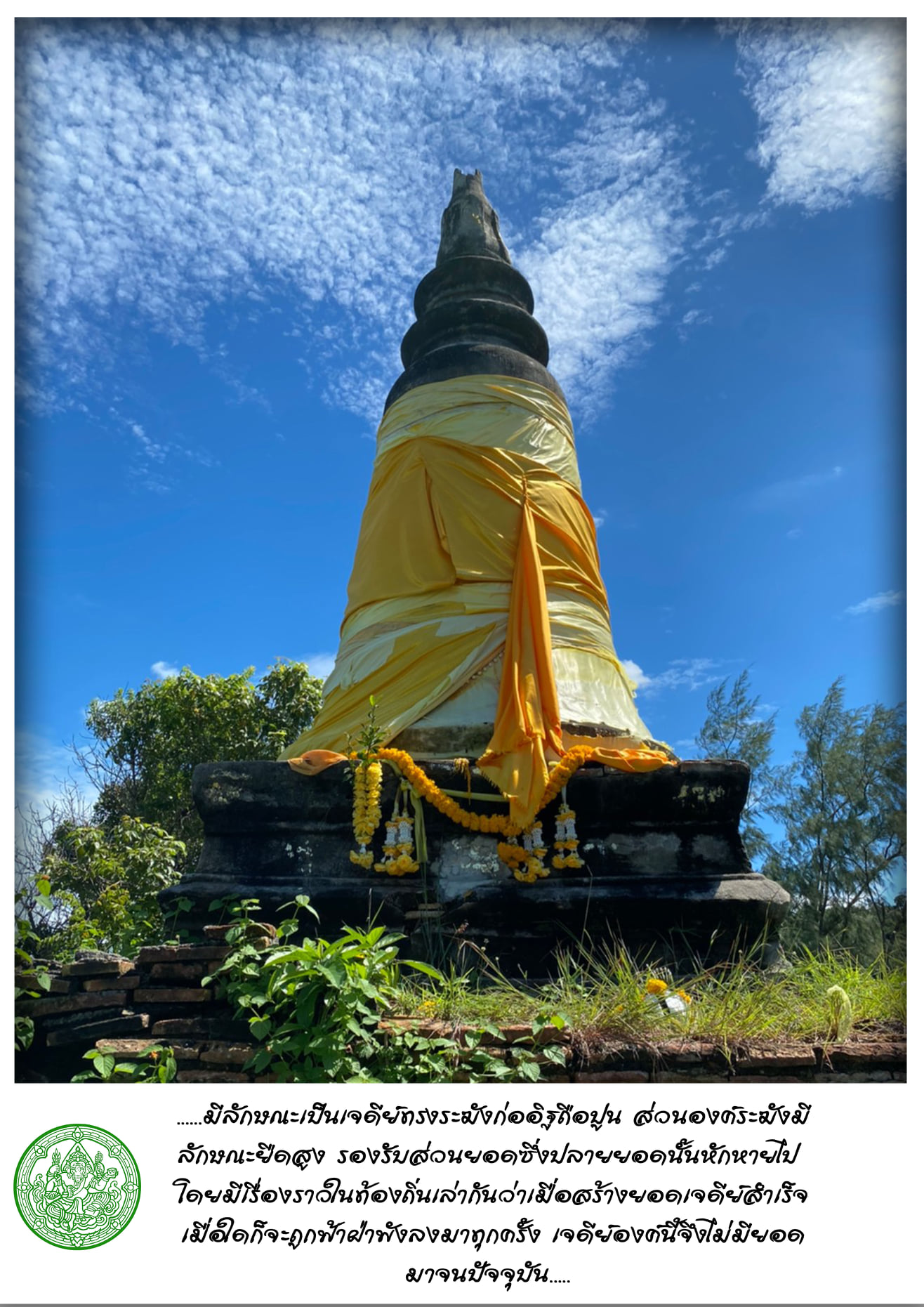 โดยมีเรื่องราวในท้องถิ่นเล่ากันว่าเมื่อสร้างยอดเจดีย์สำเร็จเมื่อใดก็จะถูกฟ้าฝ่าพังลงมาทุกครั้ง เจดีย์องค์นี้จึงไม่มียอดมาจนปัจจุบัน และยังมีเรื่องราวของถ้ำในบริเวณหน้าผาริมทะเลซึ่งเล่ากันว่าเดิมเต็มไปด้วยถ้วยชามซึ่งชาวบ้านสามารถหยิบยืมไปใช้งานได้ แต่ต่อมาถ้ำปากถ้ำแห่งนี้ได้ปิดลงกลายเป็นหน้าผาอย่างในปัจจุบัน