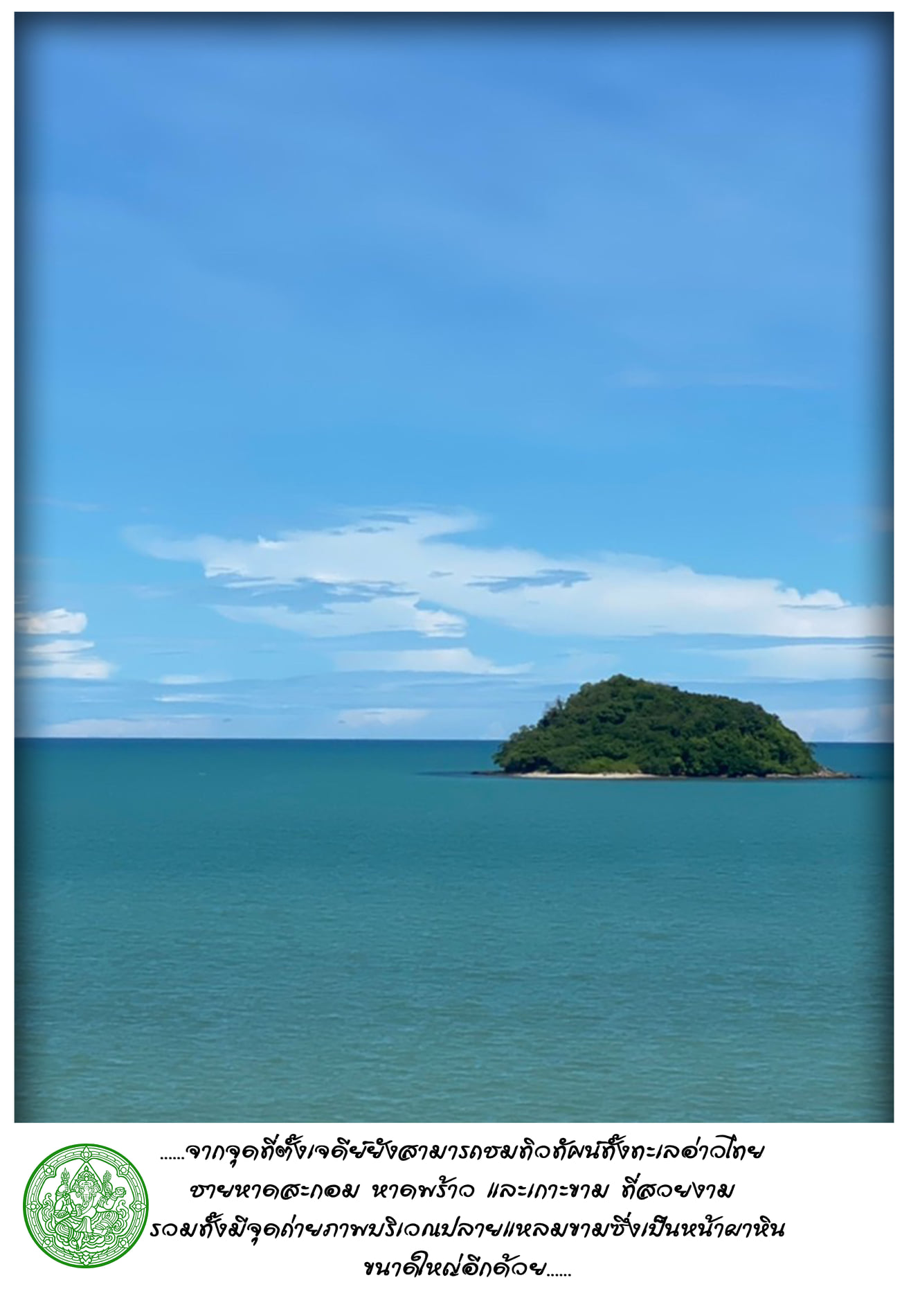 จากจุดที่ตั้งเจดีย์ยังสามารถชมทิวทัศน์ทั้งทะเลอ่าวไทย ชายหาดสะกอม หาดพร้าว และเกาะขาม ที่สวยงาม รวมทั้งมีจุดถ่ายภาพบริเวณปลายแหลมขามซึ่งเป็นหน้าผาหินขนาดใหญ่อีกด้วย
