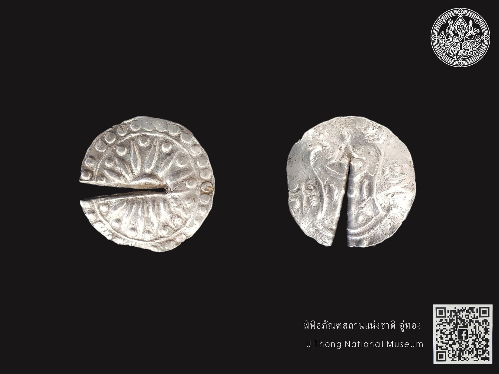 เหรียญเงินกลมแบน มีรอยตัดแบ่งตรงกึ่งกลางเหรียญ เป็นร่องทะลุจากขอบเข้ามาด้านในเหรียญประมาณ ๒ ใน ๓ ส่วน เหรียญนี้กำหนดอายุสมัยทวารวดี พุทธศตวรรษที่ ๑๒ – ๑๖ หรือประมาณ ๑,๐๐๐ – ๑,๔๐๐ ปีมาแล้ว เหรียญตกแต่งสัญลักษณ์มงคลทั้ง ๒ ด้าน มีรายละเอียด ดังนี้