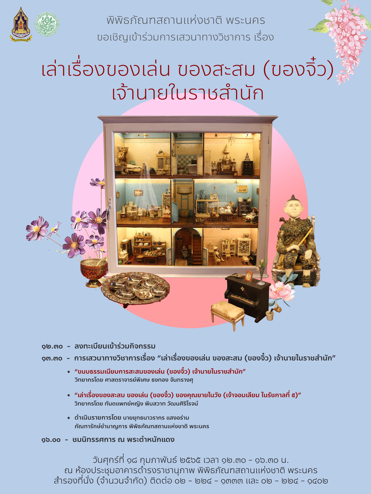 ผู้สนใจร่วมการเสวนาทางวิชาการ เรื่อง “เล่าเรื่องของเล่น ของสะสม (ของจิ๋ว) เจ้านายในราชสำนัก” ในวันศุกร์ที่ ๑๘ กุมภาพันธ์ ๒๕๖๕ เวลา ๑๓.๓๐ น. ณ ห้องประชุมอาคารดำรงราชานุภาพ พิพิธภัณฑสถานแห่งชาติ พระนคร ลงทะเบียนสำรองที่นั่งได้ที่ โทร. ๐ ๒๒๒๔ ๑๓๓๓ และ ๐ ๒๒๒๔ ๑๔๐๒ หรือชมผ่าน Facebook Live: กรมศิลปากร กระทรวงวัฒนธรรม