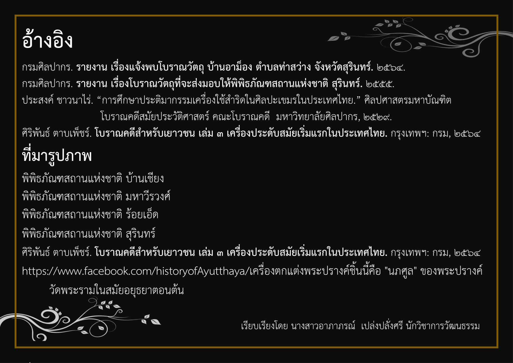 กรมศิลปากร. รายงาน เรื่องแจ้งพบโบราณวัตถุ บ้านอาม็อง ตำบลท่าสว่าง จังหวัดสุรินทร์. ๒๕๖๔.