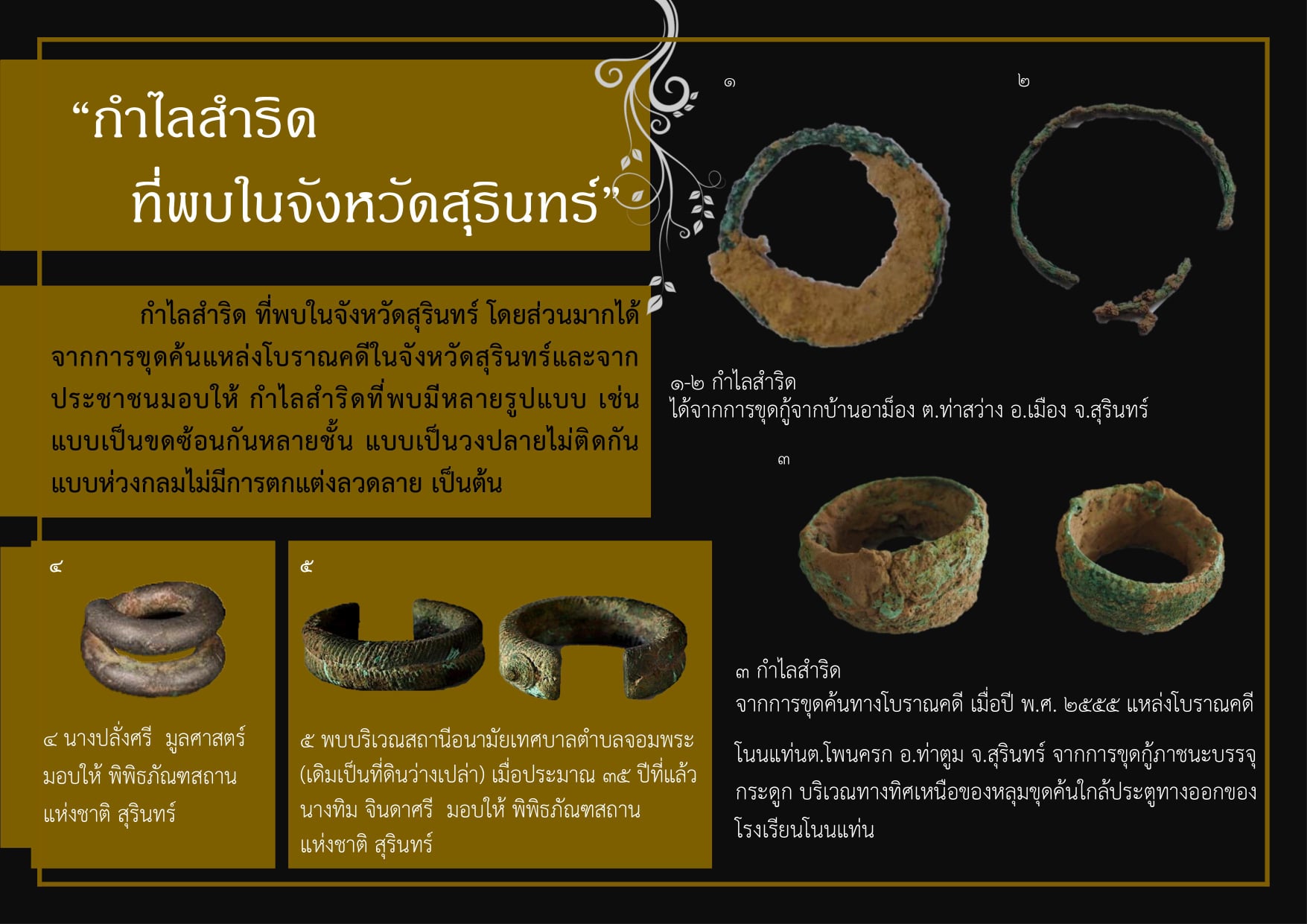 ๑. แหล่งโบราณคดีโนนแท่น ตำบลโพนครก อำเภอท่าตูม จังหวัดสุรินทร์ เป็นแหล่งโบราณคดีที่เป็นหลุมฝังศพ โดยส่วนหนึ่งจากการขุดค้นพบโบราณวัตถุ กำไลสำริด ลักษณะเป็น ๒ วงซ้อนกัน จากการขุดค้นแหล่งโบราณคดีโนนแท่น อยู่ทางทิศเหนือของหลุมขุดค้น ใกล้ประตูทางออกโรงเรียนโนนแท่นพิทยาคม พบเมื่อปี พ.ศ.๒๕๕๕ ปัจจุบันเก็บรักษา ณ คลังพิพิธภัณฑสถานแห่งชาติ สุรินทร์