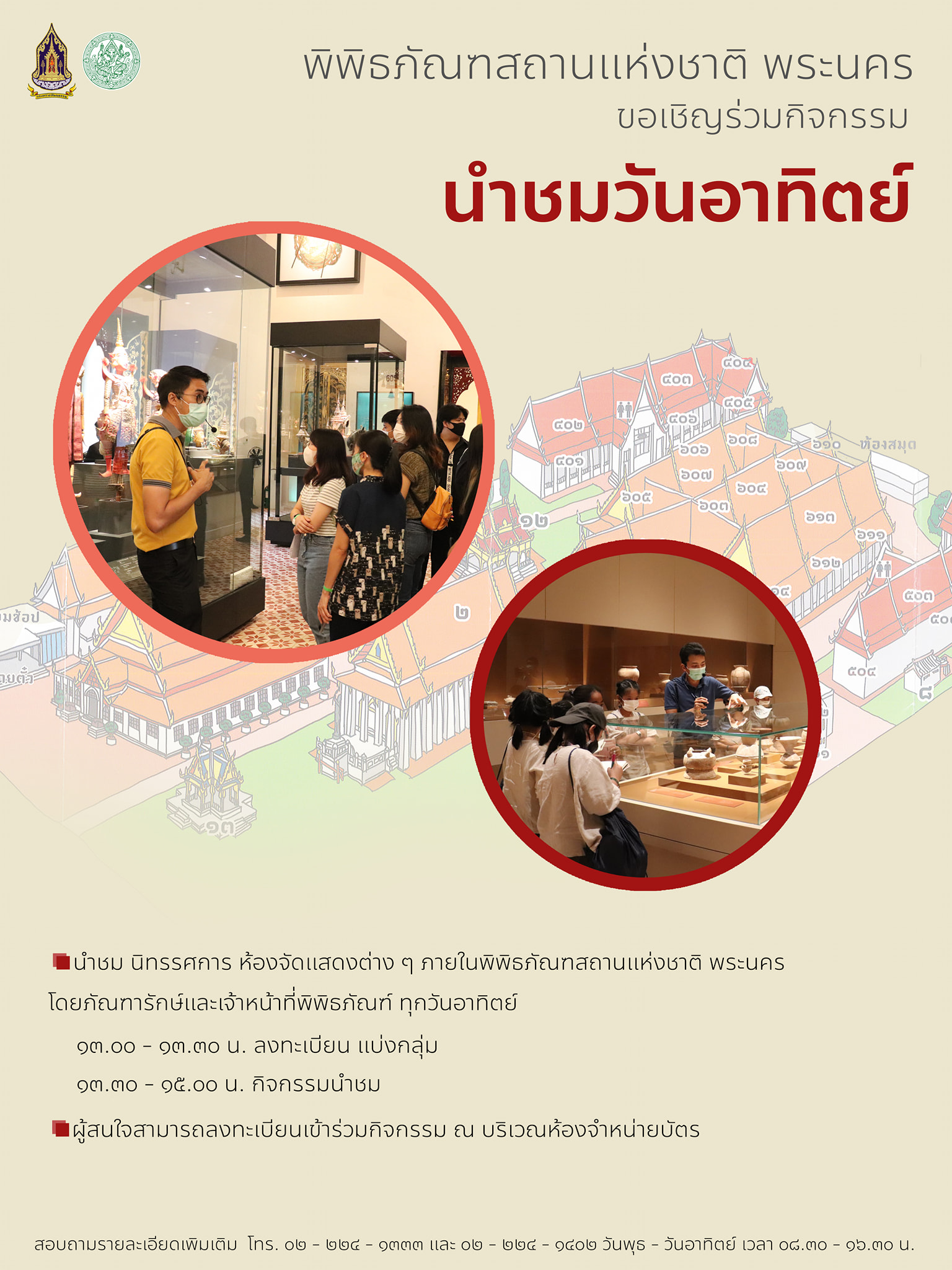 พิพิธภัณฑสถานแห่งชาติ พระนคร ขอเชิญร่วมกิจกรรม "นำชมวันอาทิตย์" เปิดรอบนำชม นิทรรศการ ห้องจัดแสดงต่าง ๆ ภายในพิพิธภัณฑสถานแห่งชาติ พระนคร สำหรับผู้สนใจเข้าชมพิพิธภัณฑ์ โดยมีภัณฑารักษ์และเจ้าหน้าที่พิพิธภัณฑ์ บรรยายนำชม ทุกบ่ายวันอาทิตย์