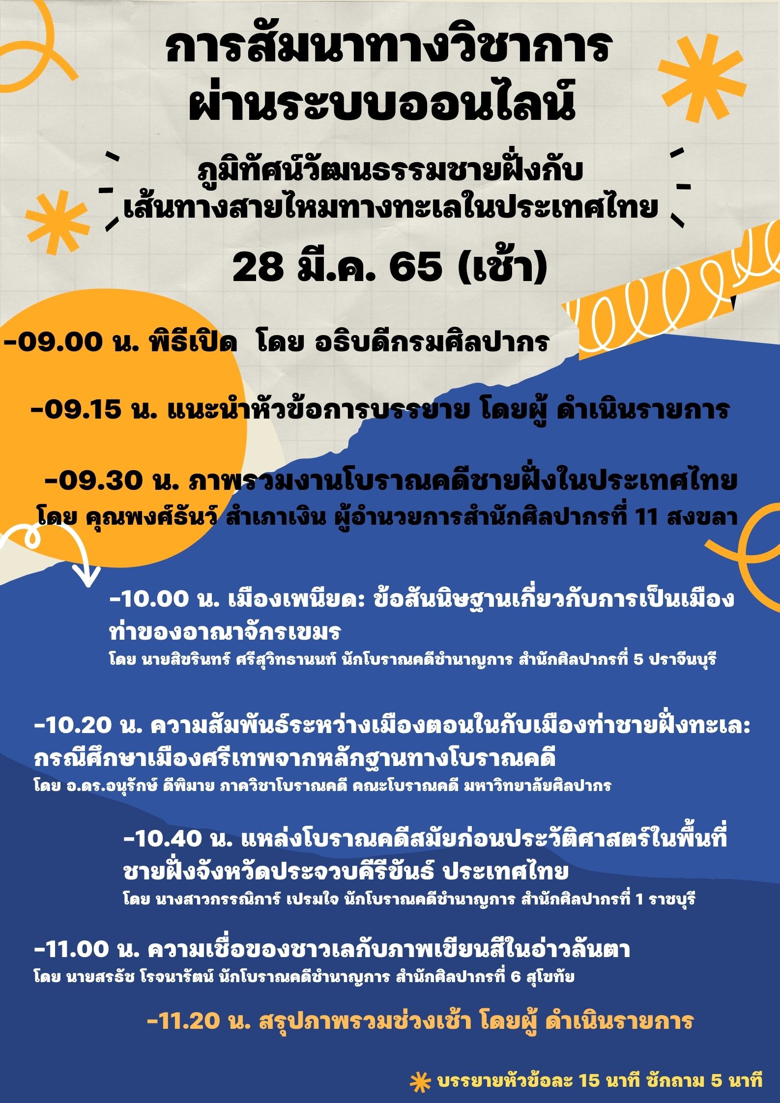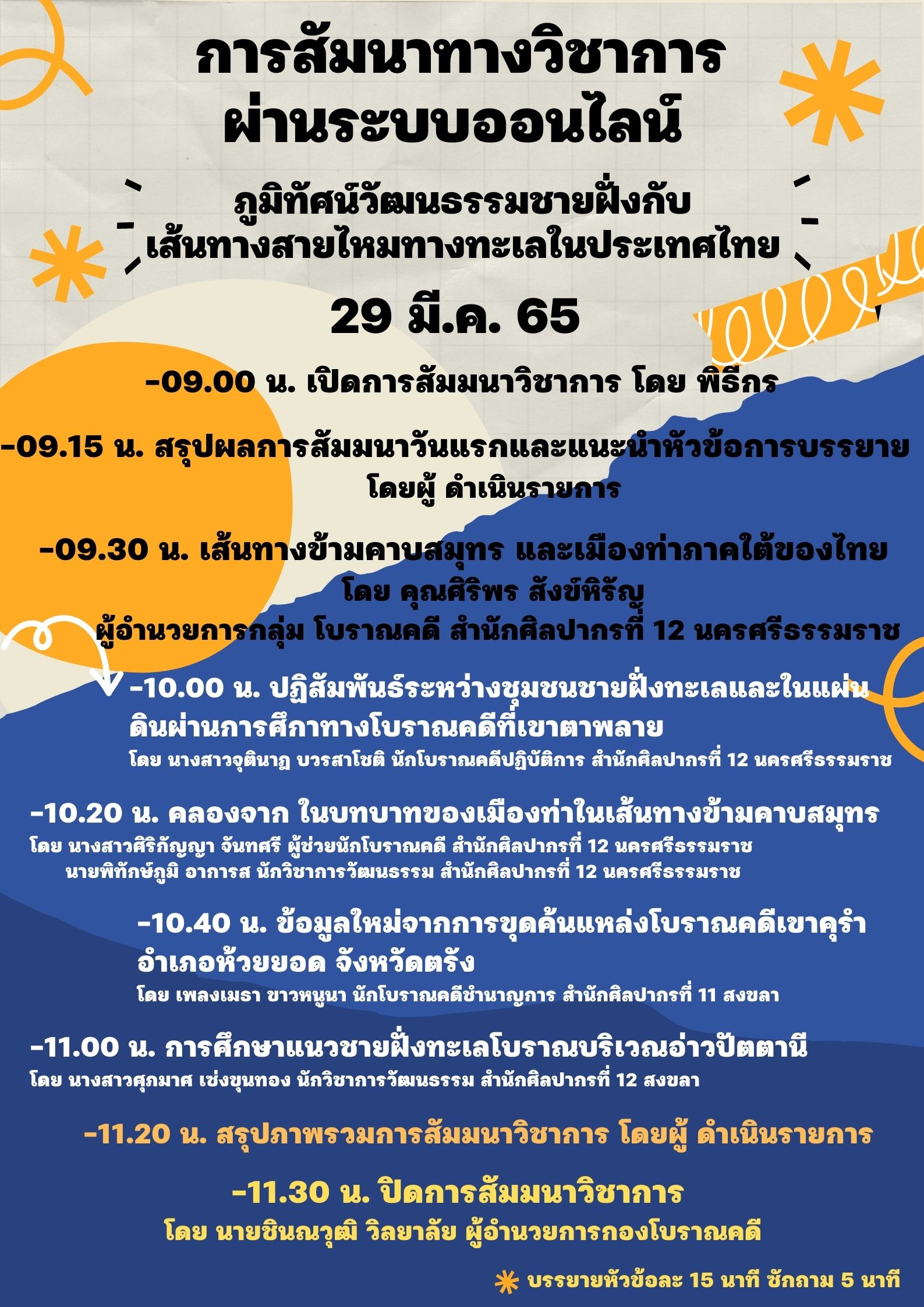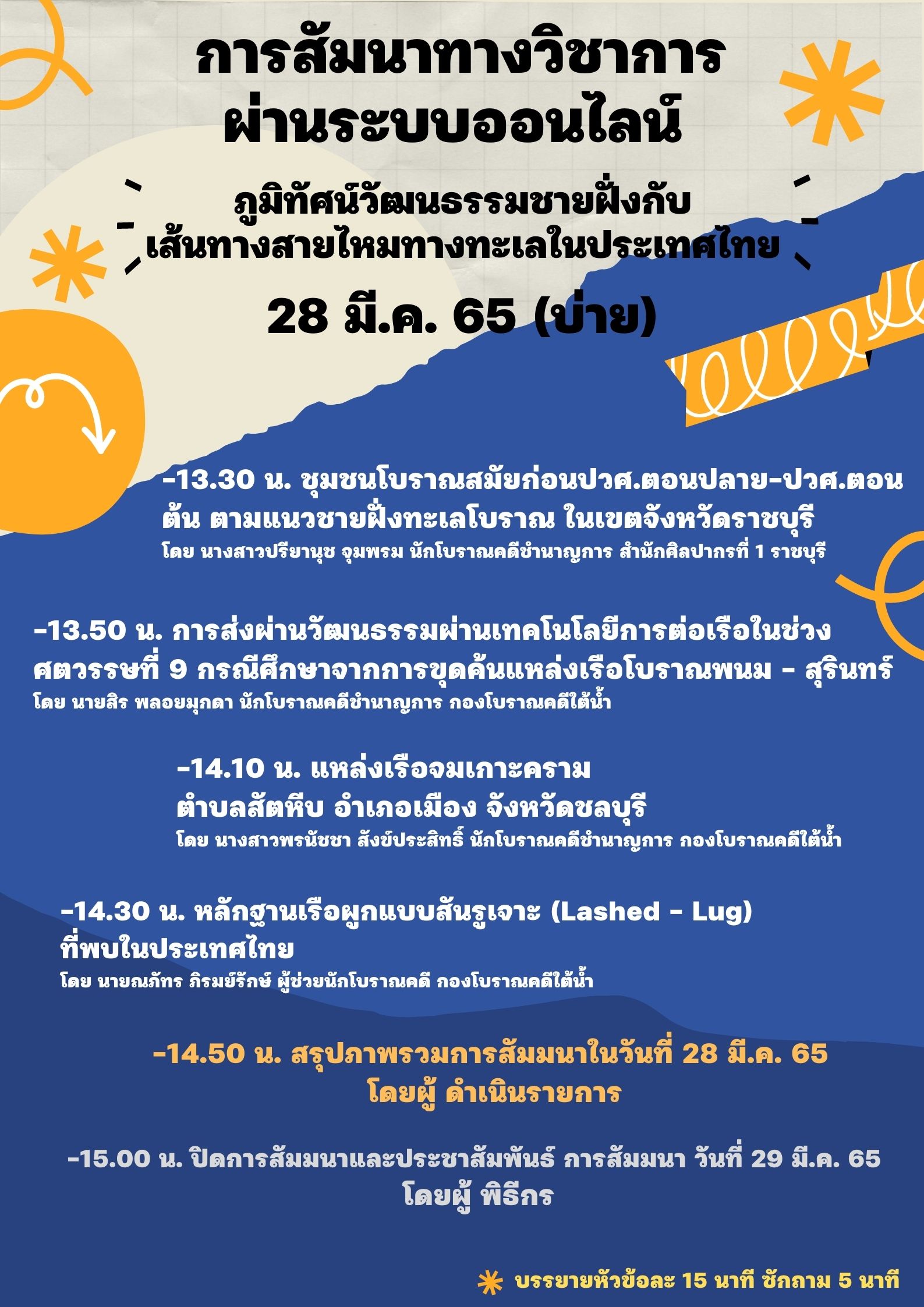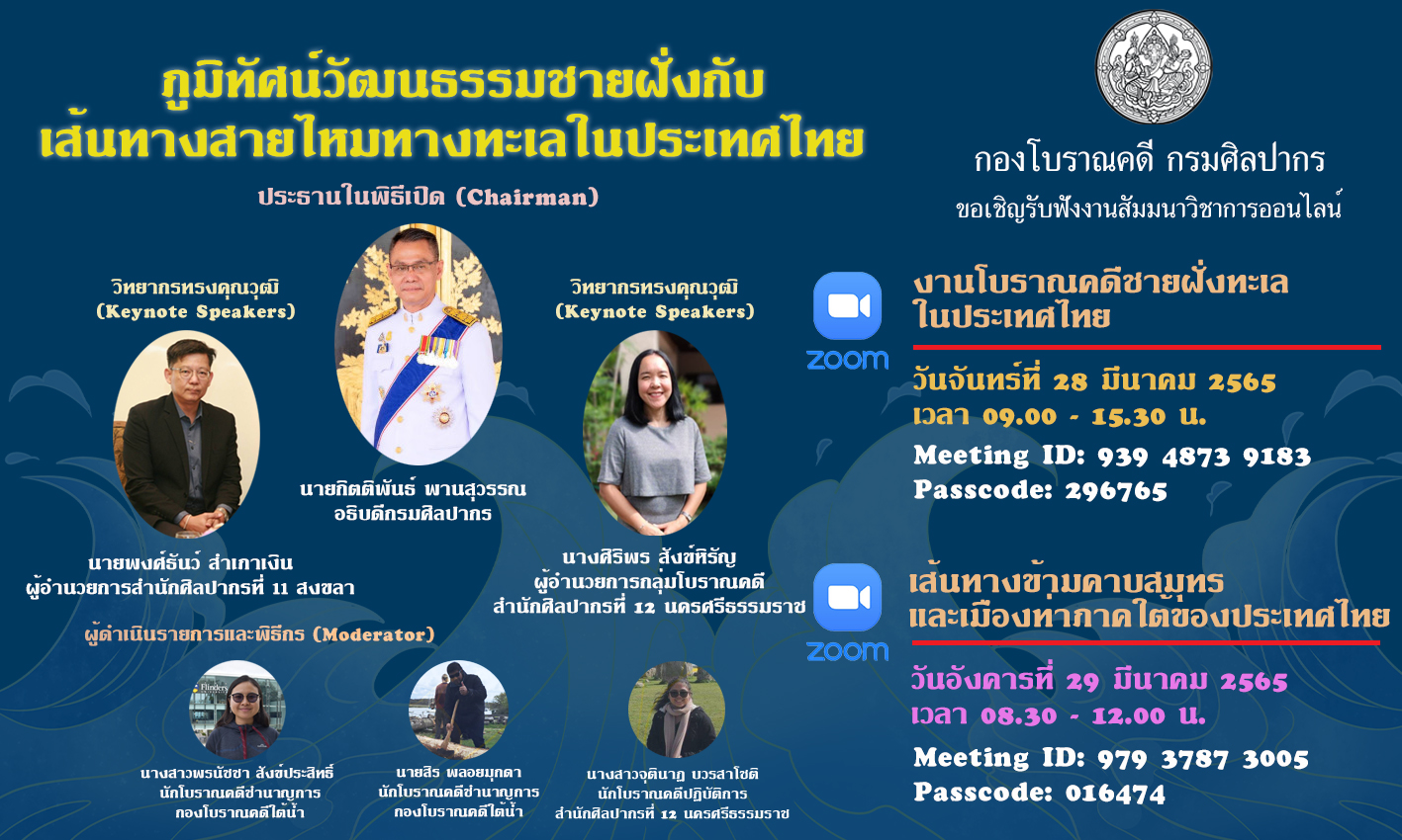 กองโบราณคดี ร่วมกับกองโบราณคดีใต้น้ํา ขอเชิญชวนผู้สนใจเข้าร่วมฟังการสัมมนาทางวิชาการออนไลน์ เรื่อง ภูมิทัศน์วัฒนธรรมชายฝั่งกับเส้นทางสายไหมทางทะเลในประเทศไทย" การสัมมนาทางวิชาการนี้มีหัวข้อการบรรยายที่น่าสนใจหลากหลาย ผู้สนใจสามารถร่วมรับฟังผ่านระบบ zoom