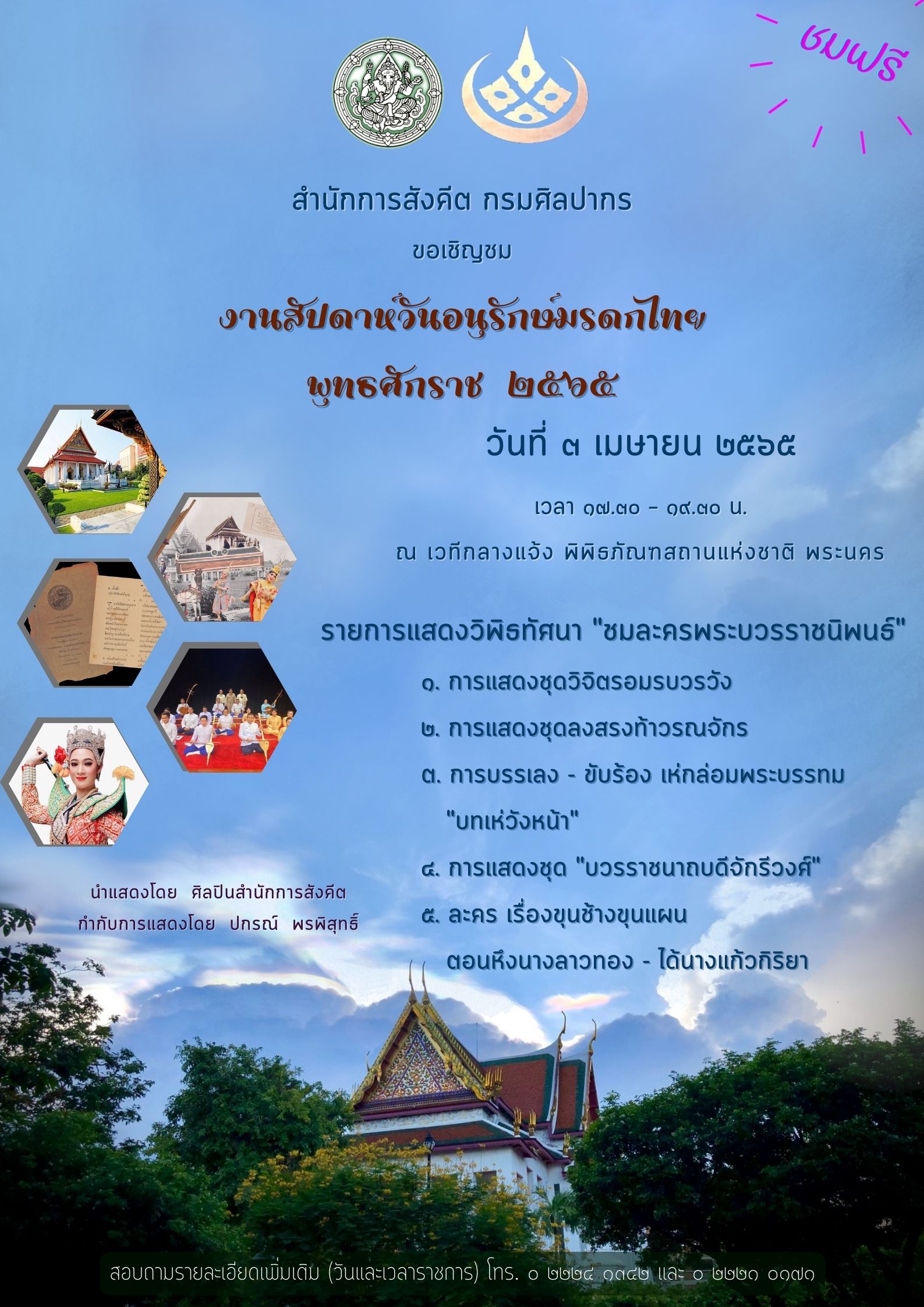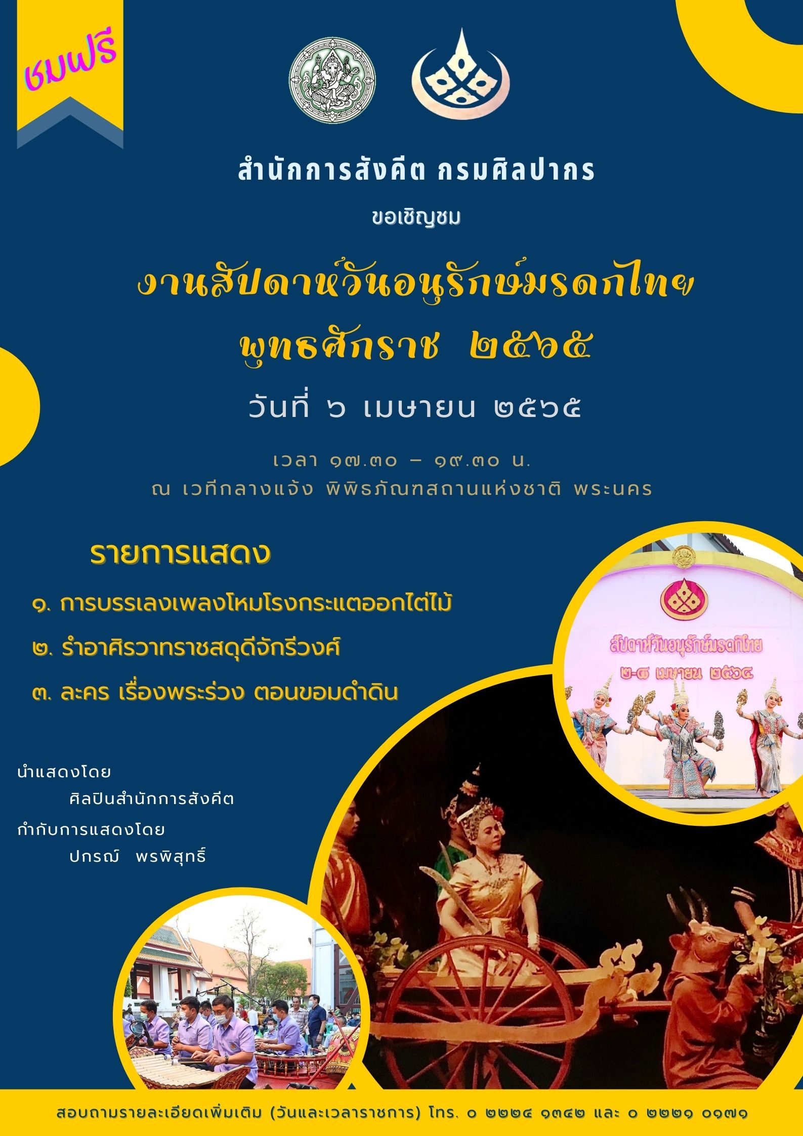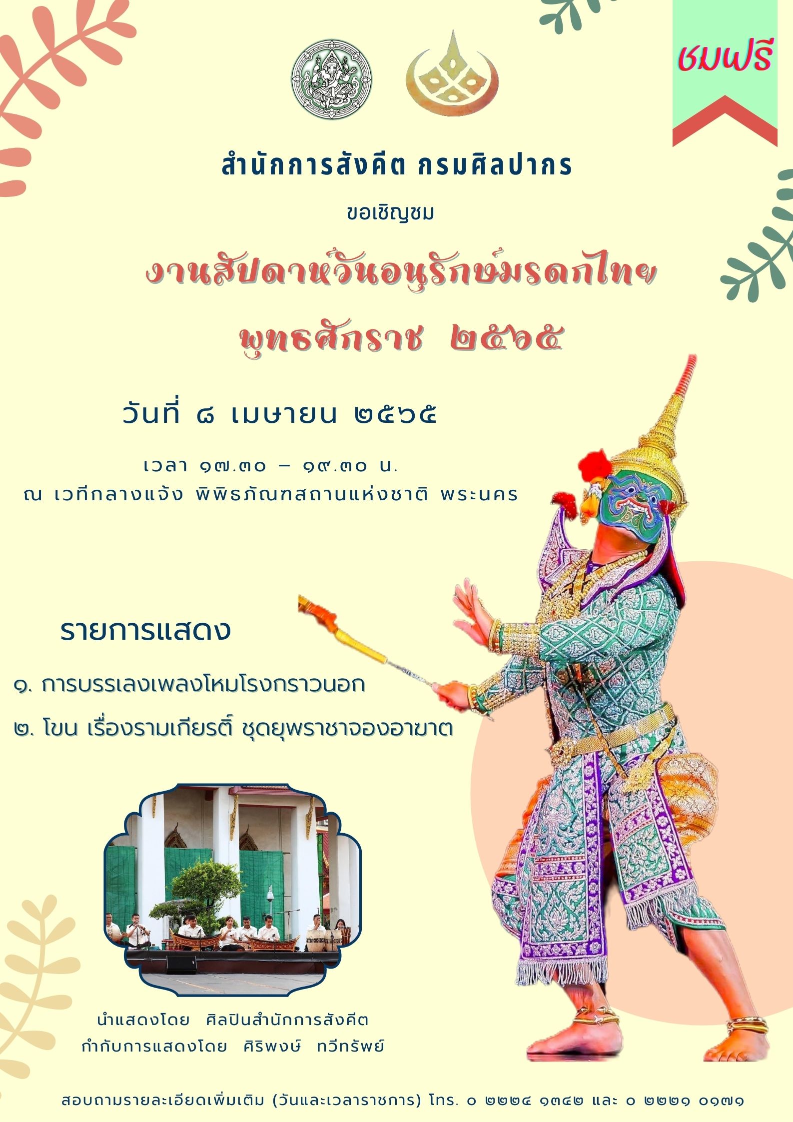 ขอเชิญชมการแสดงนาฏศิลป์และดนตรี ในงานสัปดาห์วันอนุรักษ์มรดกไทย ชมฟรี ๒ - ๘ เมษายน ๒๕๖๕
