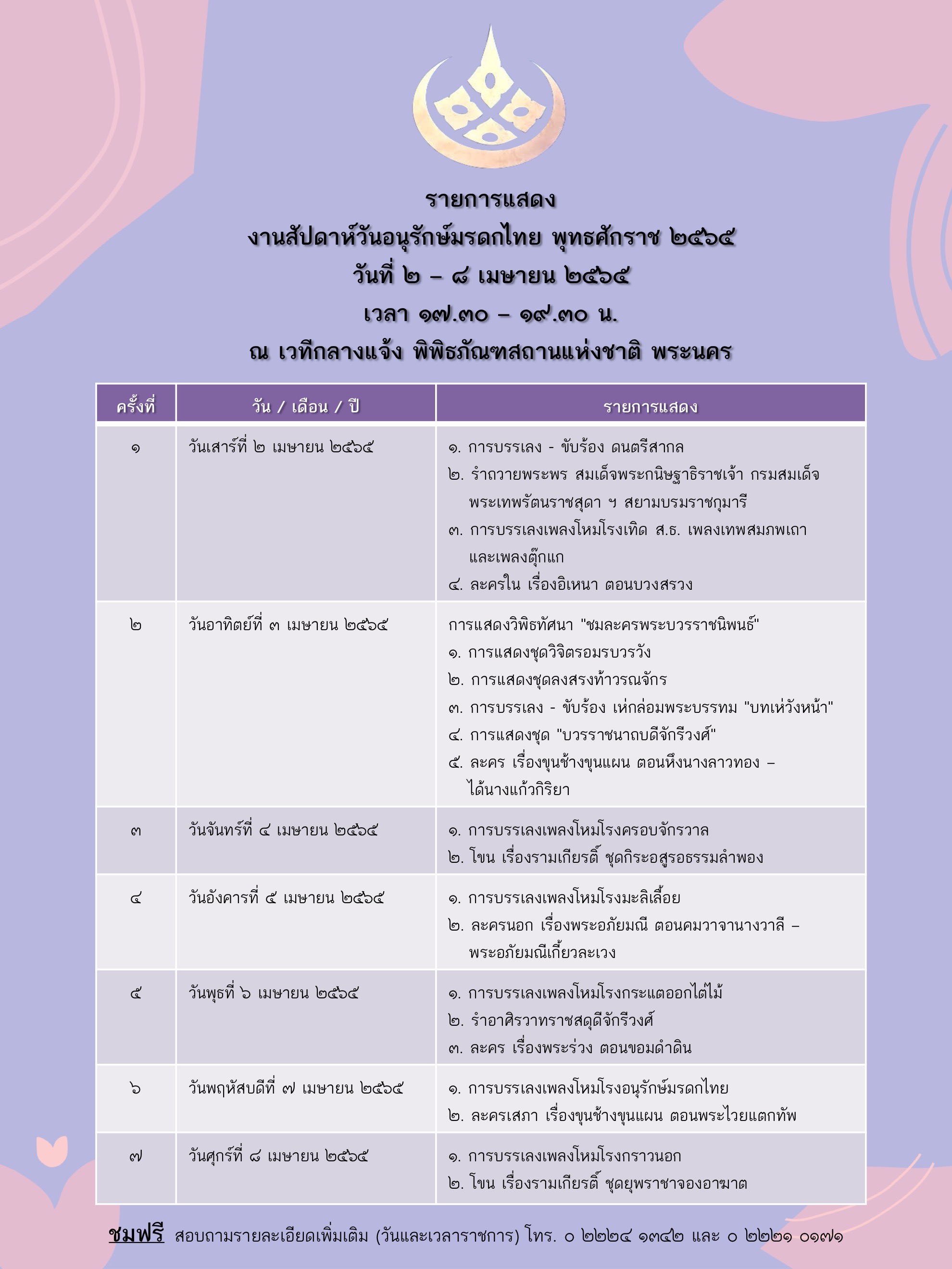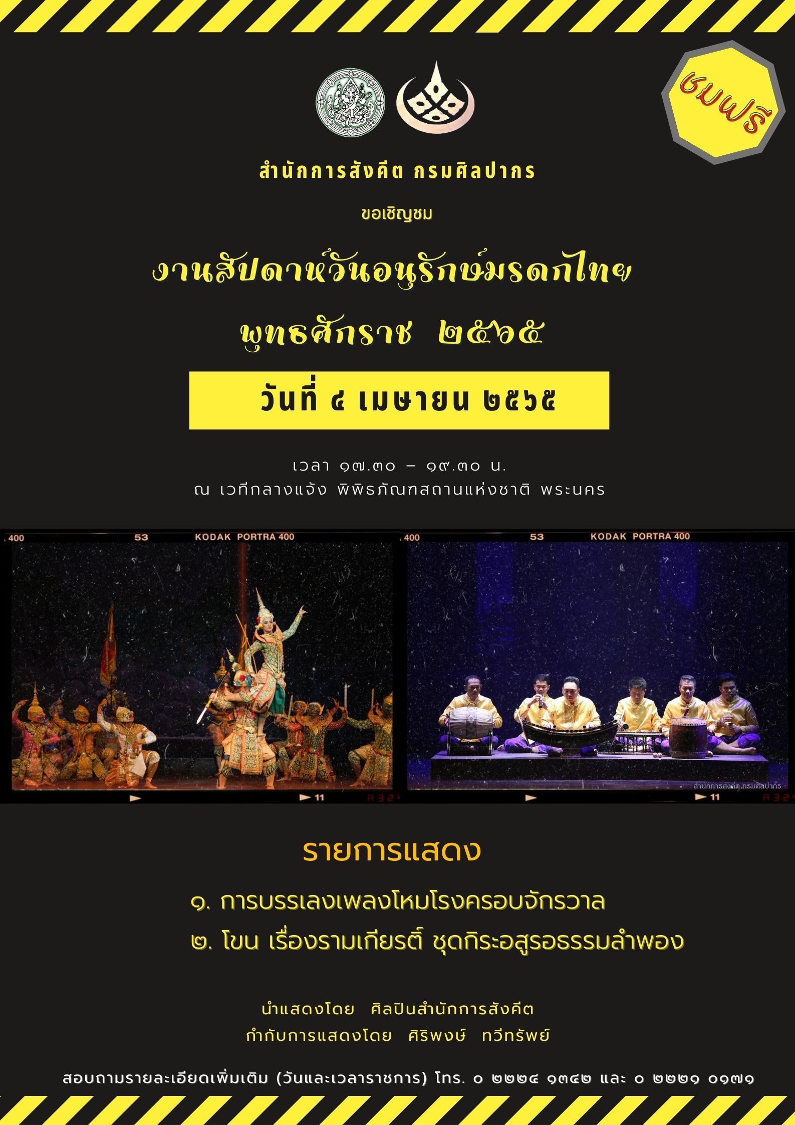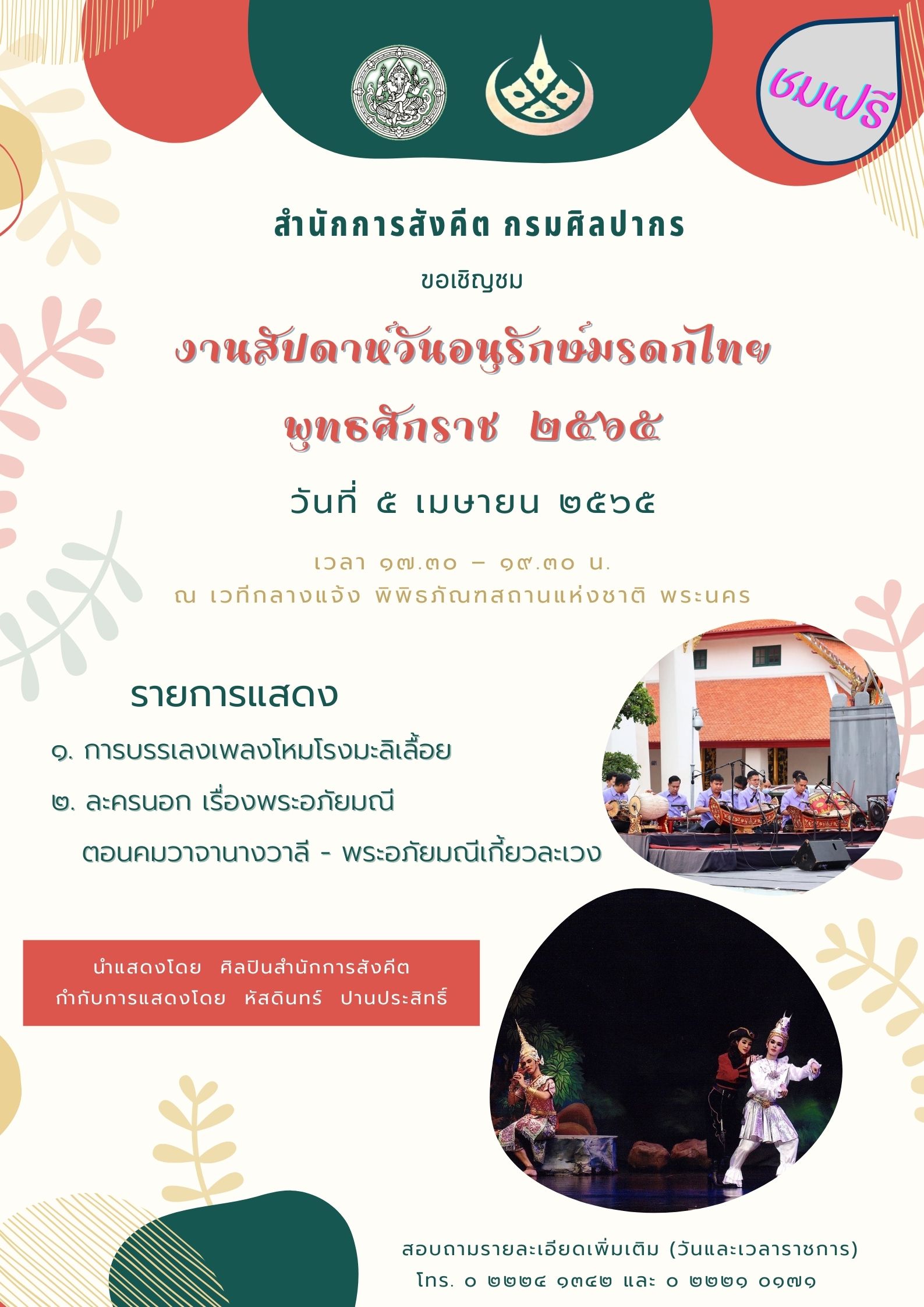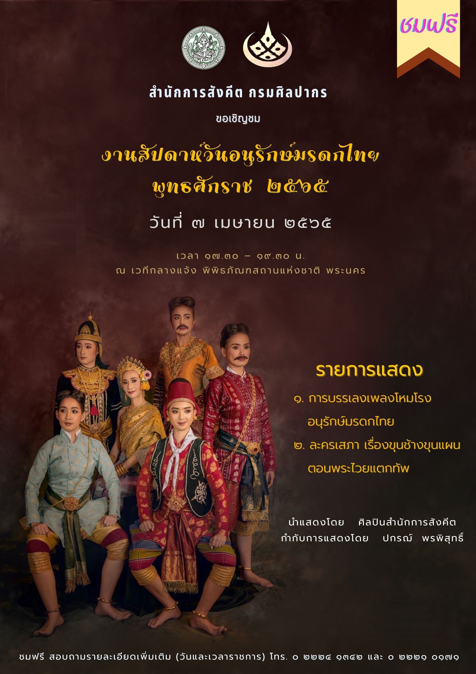 ขอเชิญชมการแสดงนาฏศิลป์และดนตรี ในงานสัปดาห์วันอนุรักษ์มรดกไทย ชมฟรี ๒ - ๘ เมษายน ๒๕๖๕