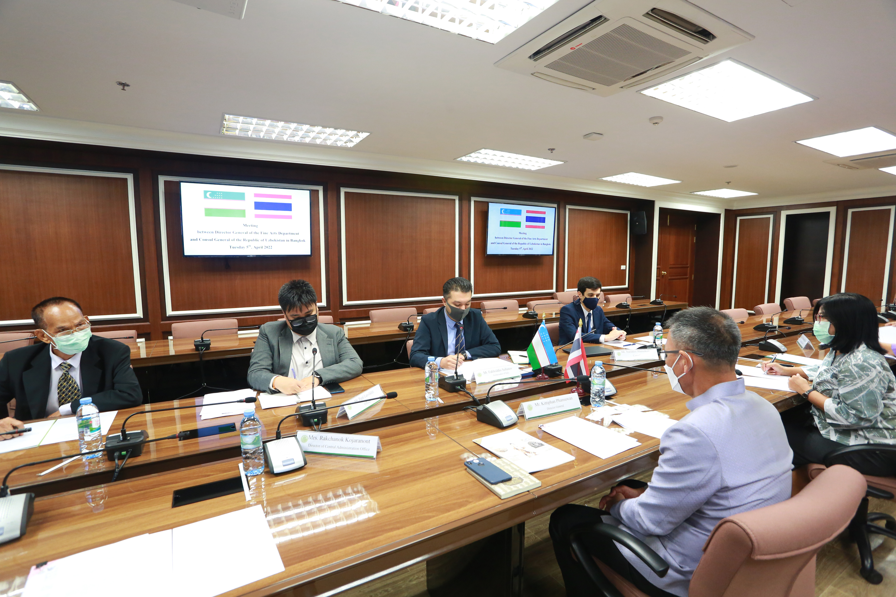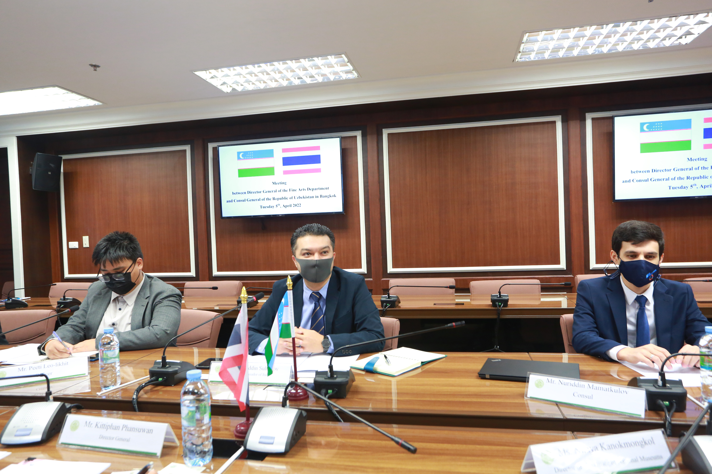 วันอังคารที่ ๕ เมษายน พ.ศ.๒๕๖๕ เวลา ๑๐.๐๐ น. นายกิตติพันธ์ พานสุวรรณ อธิบดีกรมศิลปากร พร้อมด้วย นางสาวนิตยา กนกมงคล ผู้อำนวยการสำนักพิพิธภัณฑสถานแห่งชาติ นางสาวพยุง วงษ์น้อย นักโบราณคดีเชี่ยวชาญ ร่วมประชุมกับนายฟาคริติน ซุลตานอฟ กงสุลใหญ่สาธารณรัฐอุซเบกิสถานประจำประเทศไทย นายนูริดดิน มามัตคูลอฟ กงสุลสาธารณรัฐอุซเบกิสถานประจำประเทศไทย ดร.พันธ์ศักดิ์ บุญโศภณพงศ์ ที่ปรึกษาด้านพระพุทธศาสนาในเชียกลางและคณะ เรื่อง การนำเสนอข้อมูลแหล่งโบราณสถานและโบราณวัตถุทางพระพุทธ ศาสนาในภูมิภาคเอเชียกลาง โดยเฉพาะในสมัยจักรวรรดิคูชาน กุษาณะของสาธารณรัฐอุซเบกิสถานและความร่วมมือด้านประวัติศาสตร์และวัฒนธรรม ณ ห้องประชุม ๑ ชั้น ๘ อาคารกรมศิลปากร เทเวศร์