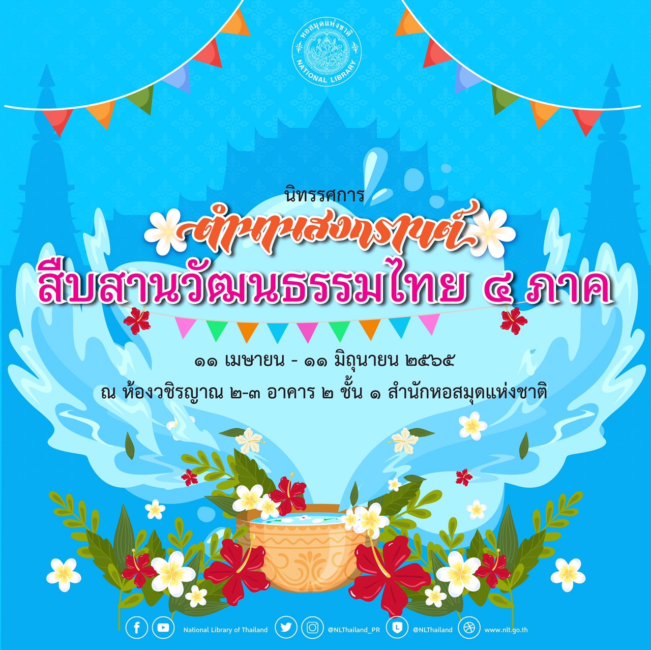 สำนักหอสมุดแห่งชาติ ขอเชิญชมนิทรรศการ “ตำนานสงกรานต์ สืบสานวัฒนธรรมไทยสี่ภาค” ผ่านการสัมผัสและเรียนรู้เรื่องราวความเป็นมาทางวัฒนธรรมประเพณีสงกรานต์ หรือวันขึ้นปีใหม่ของชาวไทย ประเพณีเก่าแก่ที่สืบทอดกันมาแต่โบราณที่ยังคงความงดงาม อ่อนโยน เอื้ออาทร และเต็มไปด้วยบรรยากาศของความกตัญญู ความสนุกสนาน ความอบอุ่น และการให้เกียรติเคารพซึ่งกัน