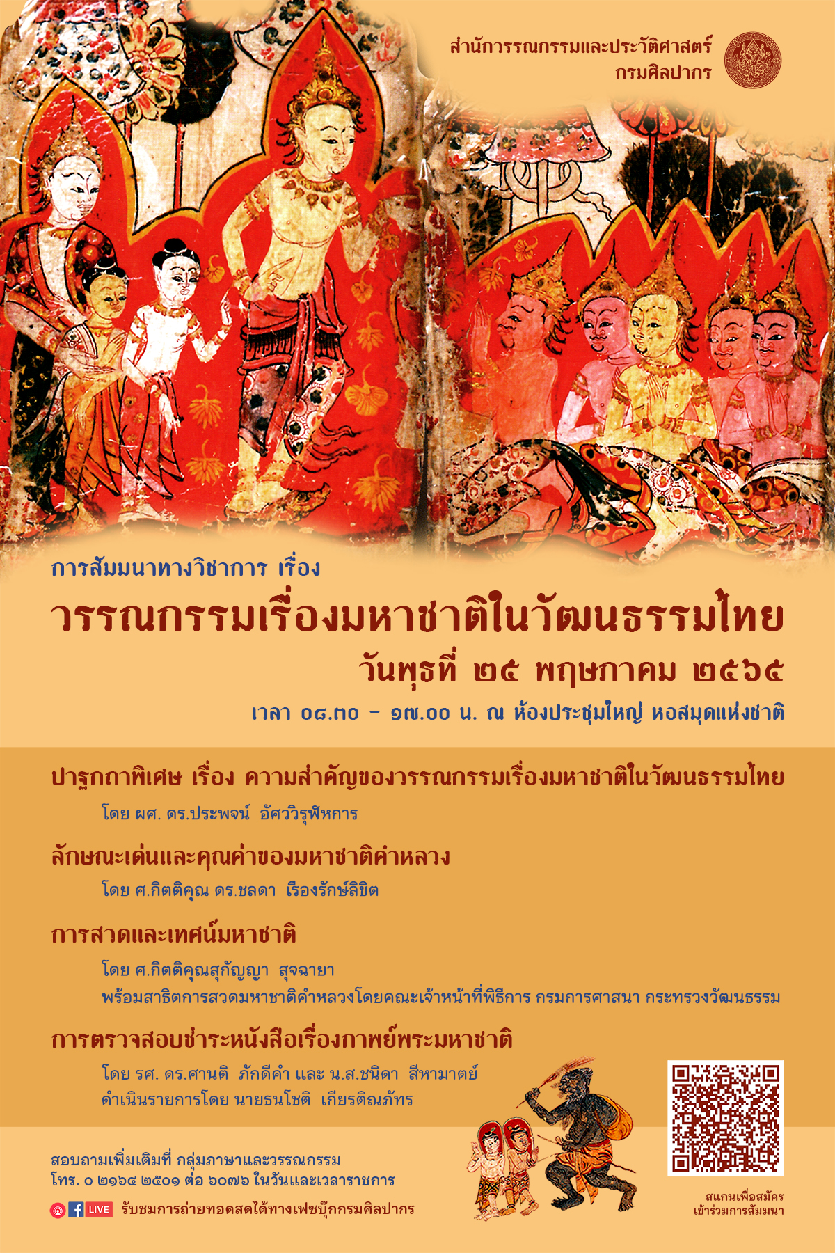 กรมศิลปากร ในนามคณะกรรมการวรรณคดีแห่งชาติ กำหนดจัดการสัมมนาทางวิชาการเรื่อง วรรณกรรมเรื่องมหาชาติในวัฒนธรรมไทย เพื่อเผยแพร่ความรู้ความเข้าใจเกี่ยวกับวรรณคดีเรื่องมหาชาติคำหลวงและวรรณคดีเรื่องมหาชาติสำนวนต่าง ๆ ที่มีคุณค่าด้านวรรณศิลป์ตลอดจนคุณค่าด้านวัฒนธรรม ประเพณี และคติความเชื่อ ในวันที่ ๒๕ พฤษภาคม ๒๕๖๕ เวลา ๐๘.๓๐ – ๑๗.๐๐ น. ณ ห้องประชุมใหญ่ สำนักหอสมุดแห่งชาติ