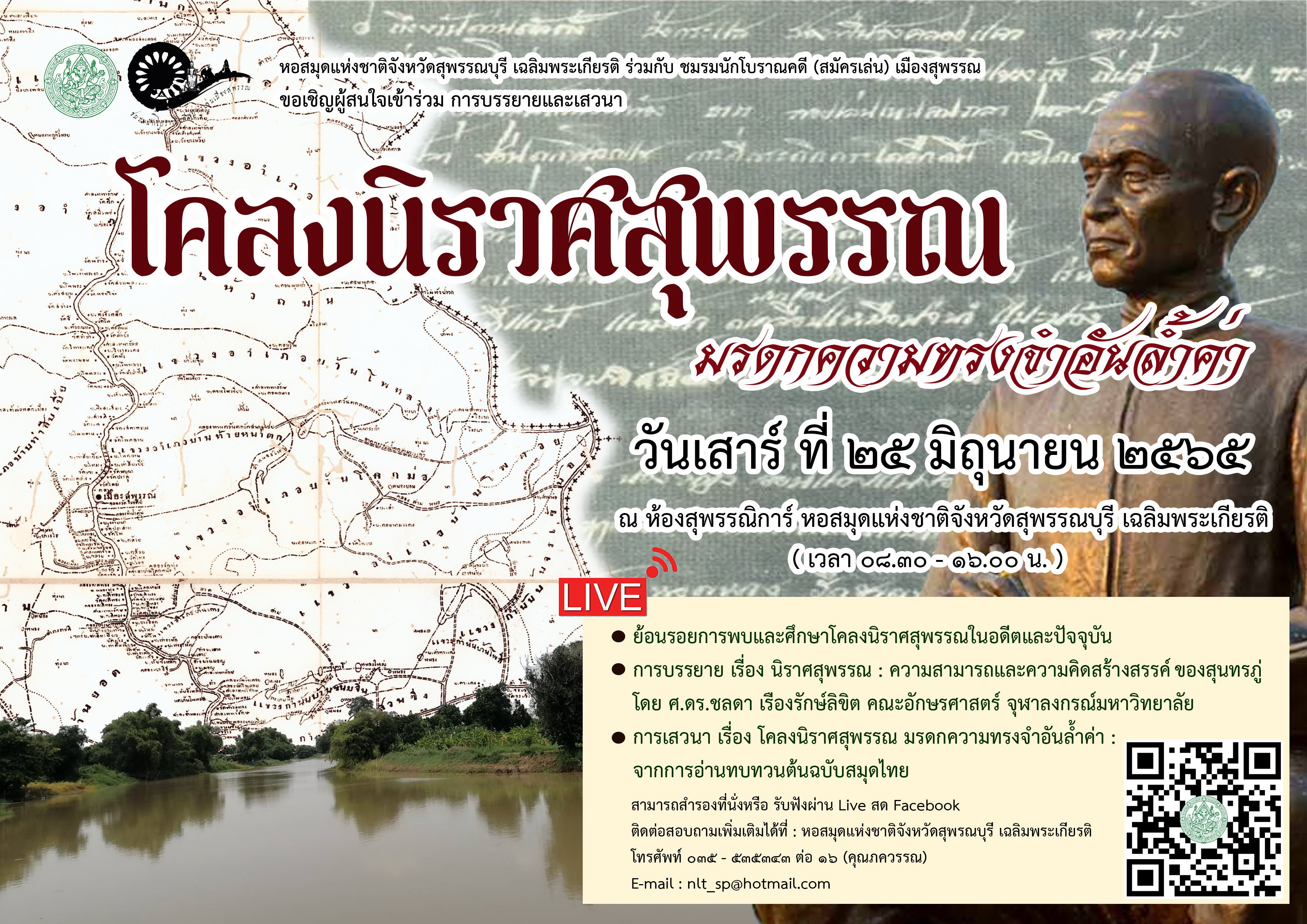หอสมุดแห่งชาติจังหวัดสุพรรณบุรี เฉลิมพระเกียรติ สำนักศิลปากรที่ ๒ สุพรรณบุรี ร่วมกับ ชมรมนักโบราณคดี (สมัครเล่น) เมืองสุพรรณ ขอเชิญผู้สนใจเข้าร่วมบรรยายและเสวนาวิชาการ เรื่อง โคลงนิราศสุพรรณ มรดกความทรงจำอันล้ำค่า