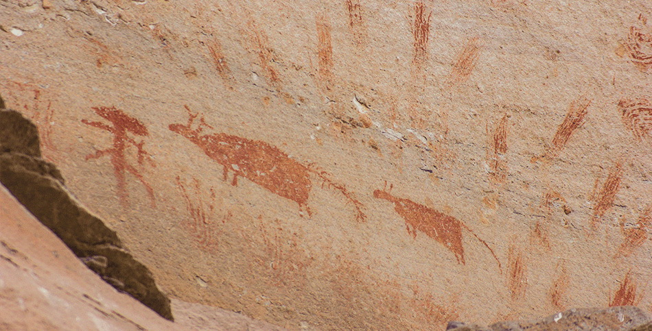 ภาพเขียนสีบนผนังเพิงผา แสดงร่องรอยการเพาะปลูกข้าว (นาข้าว) และเลี้ยงปศุสัตว์ (วัวควาย) ที่ผาหมอนน้อย อุทยานแห่งชาติผาแต้ม จังหวัดอุบลราชธานี