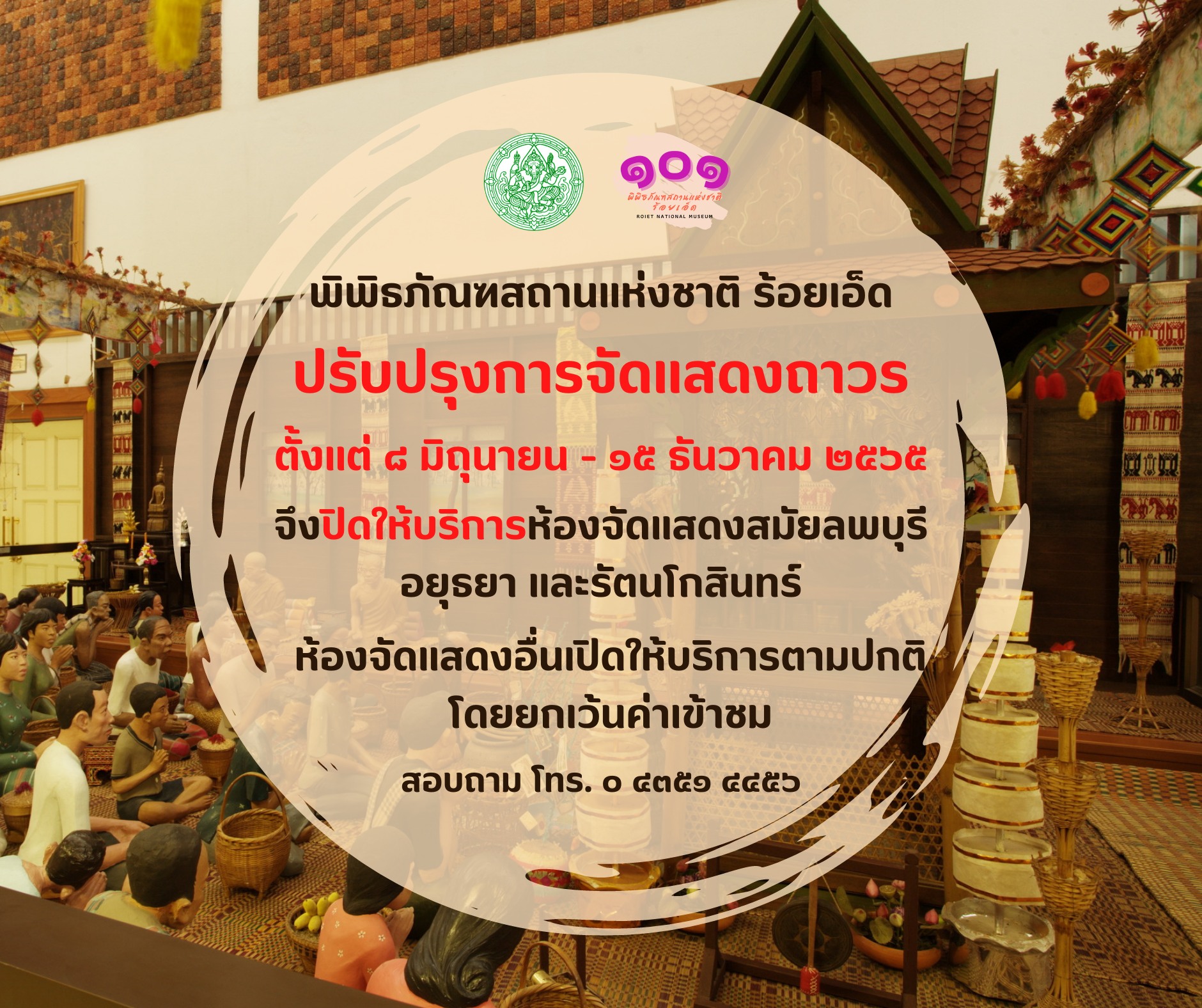 พิพิธภัณฑสถานแห่งชาติ ร้อยเอ็ด ปิดปรับปรุงส่วนจัดแสดงถาวรบางส่วน วันที่ ๘ มิถุนายน - ๑๕ ธันวาคม ๒๕๖๕